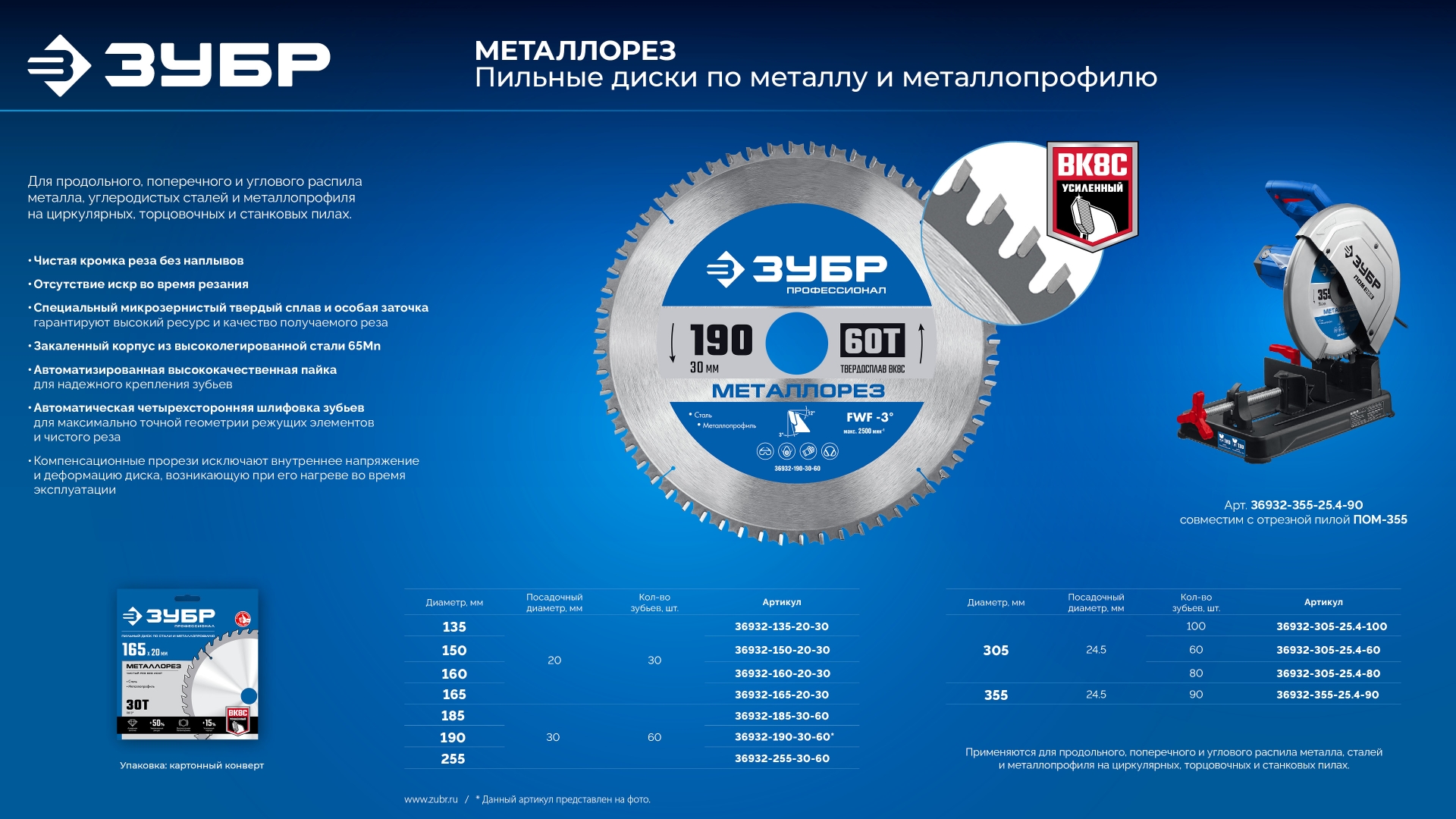 Для продольного, поперечного и углового распила металла, сталей и металлопрофиля на циркулярных, торцовочных и станковых пилах.