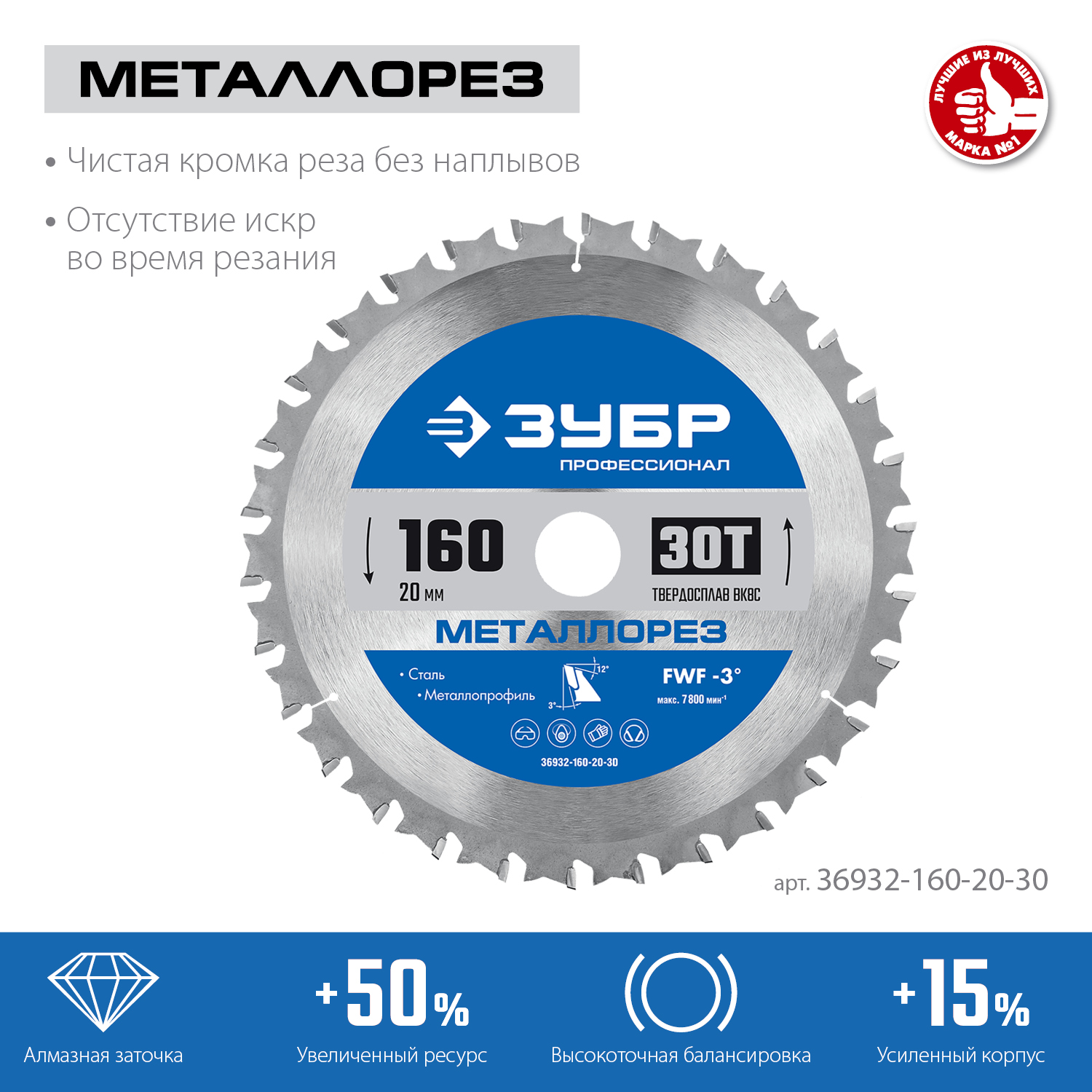 ЗУБР Металлорез, 160 х 20 мм, 30Т, пильный диск по металлу и металлопрофилю, Профессионал (36932-160-20-30)