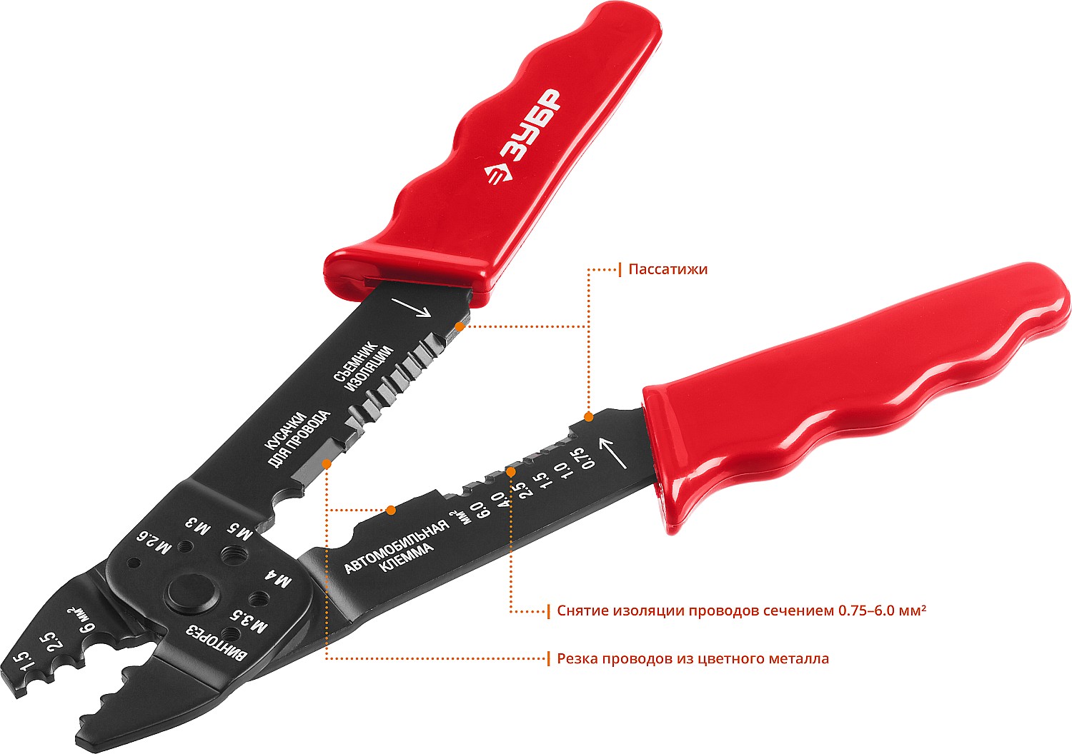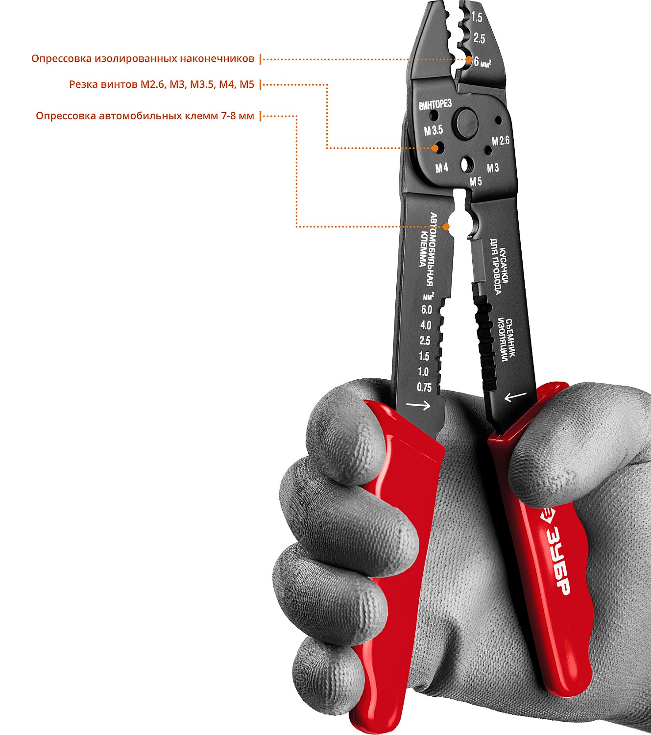 для снятия изоляции, обжима наконечников, резки кабеля.