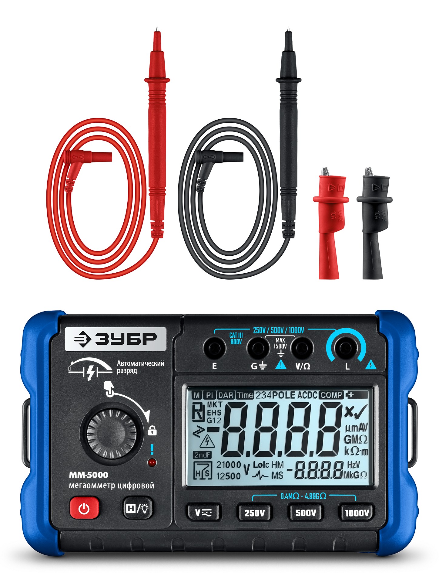Мегаомметр ЗУБР предназначен для точного измерения сопротивления изоляции. В случае возникновения высокого напряжения в исследуемой электрической цепи срабатывает световая индикация.