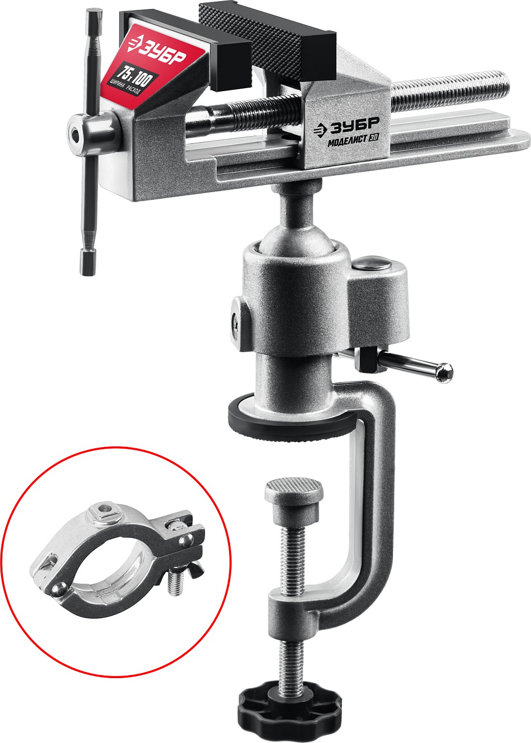 - Быстрая и надежная установка тисков на столе осуществляется с помощью струбцины