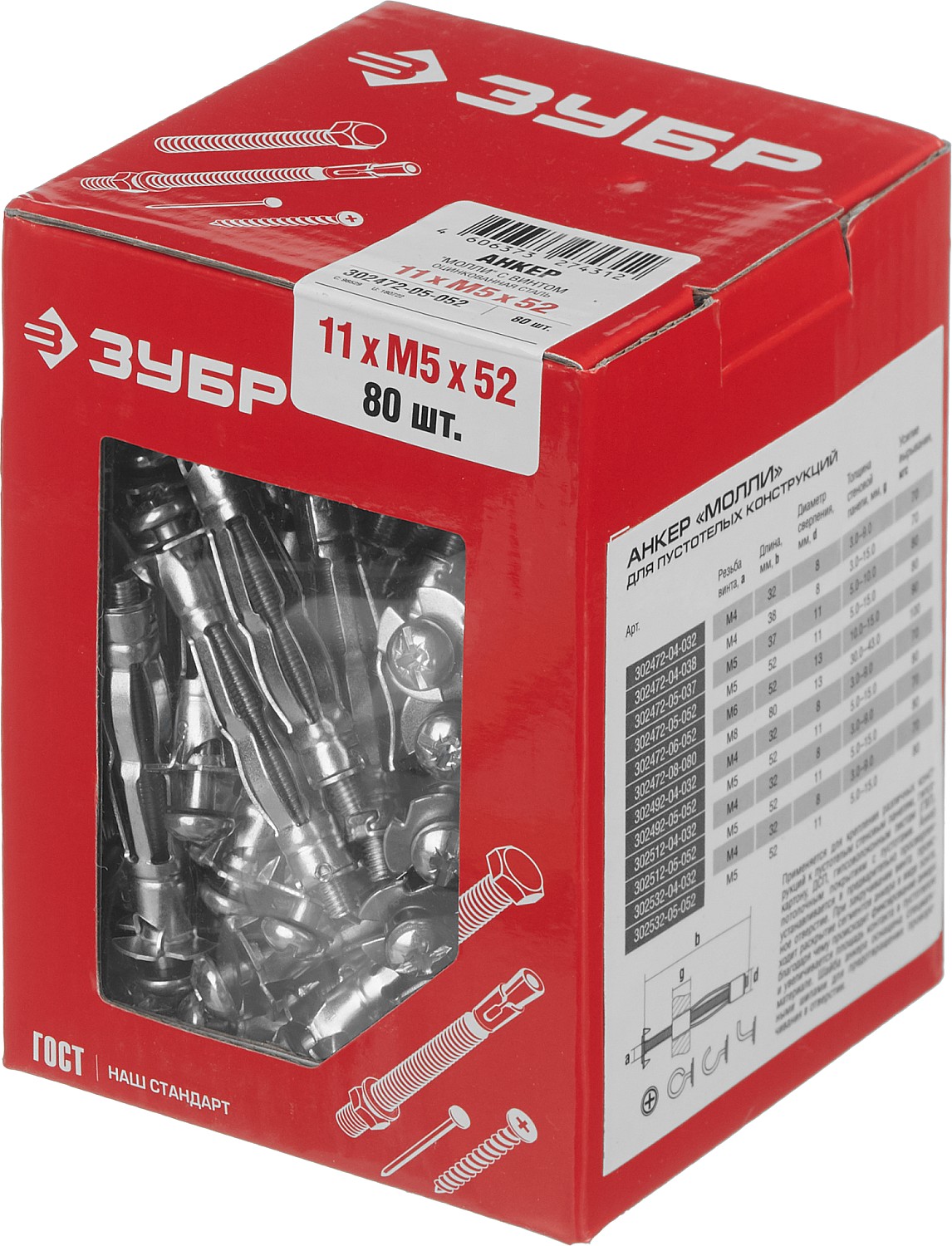 ЗУБР МОЛЛИ, М5 х 52 х 11 мм, 80 шт, анкер для пустотелых конструкций (302472-05-052)