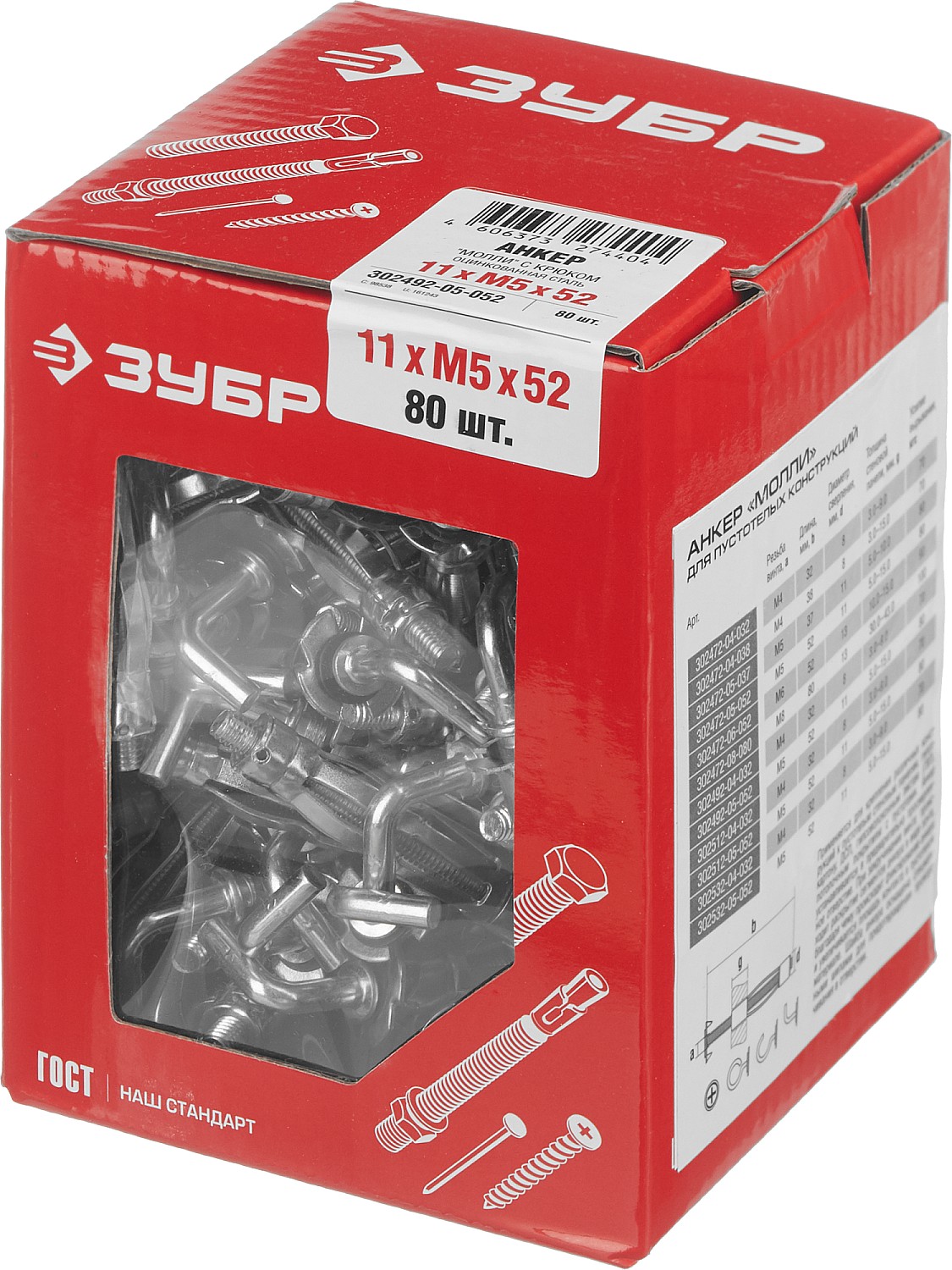 ЗУБР МОЛЛИ, М5 х 52 х 11 мм, 80 шт, анкер с крюком для пустотелых конструкций (302492-05-052)