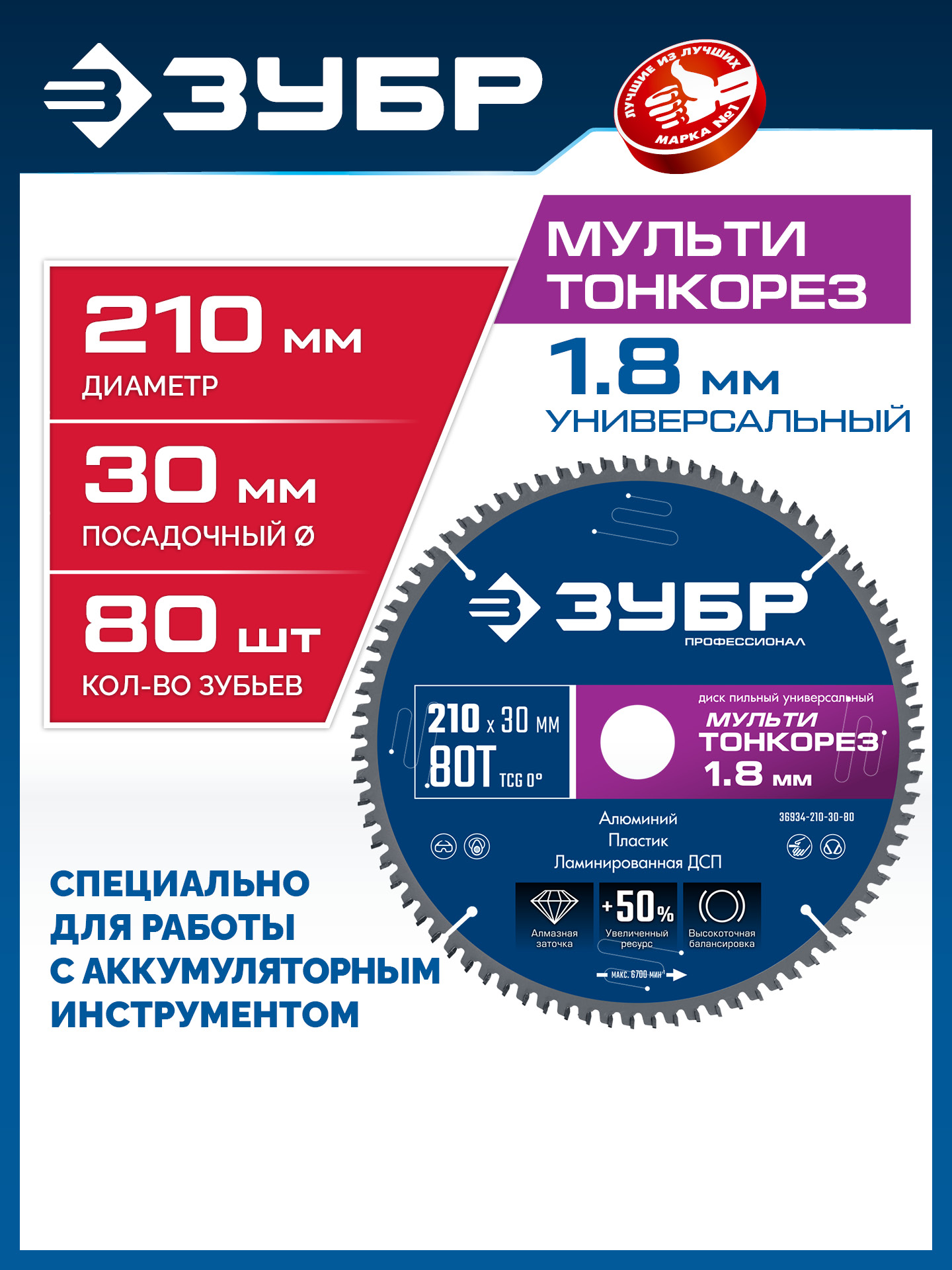 ЗУБР Мульти Тонкорез 210х30 x 1.8 мм, 80Т, диск пильный универсальный, тонкий рез, Профессионал (36934-210-30-80)