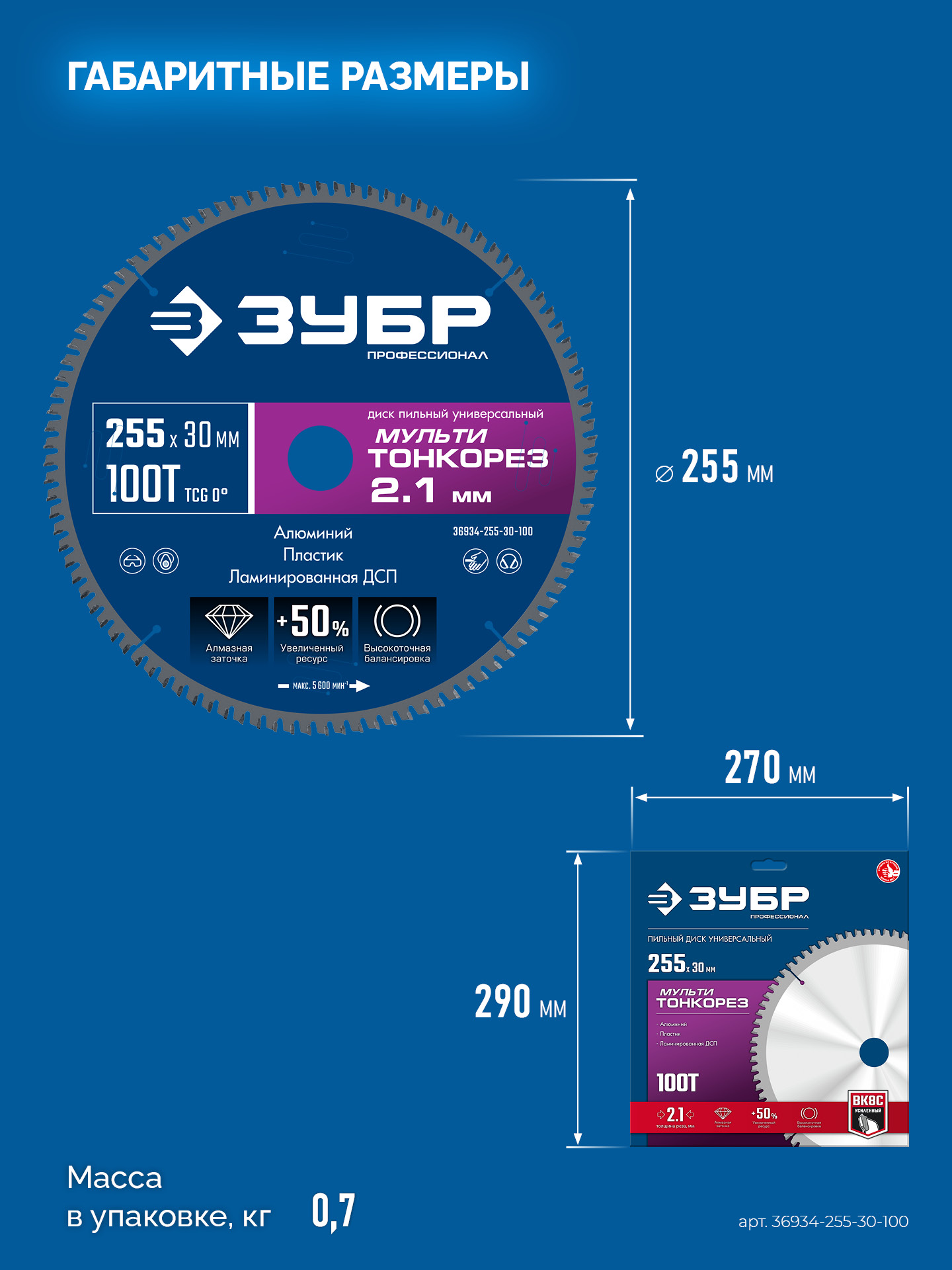 ЗУБР Мульти Тонкорез 255х30 x 2.1 мм, 100Т, диск пильный универсальный тонкий рез, Профессионал (36934-255-30-100)