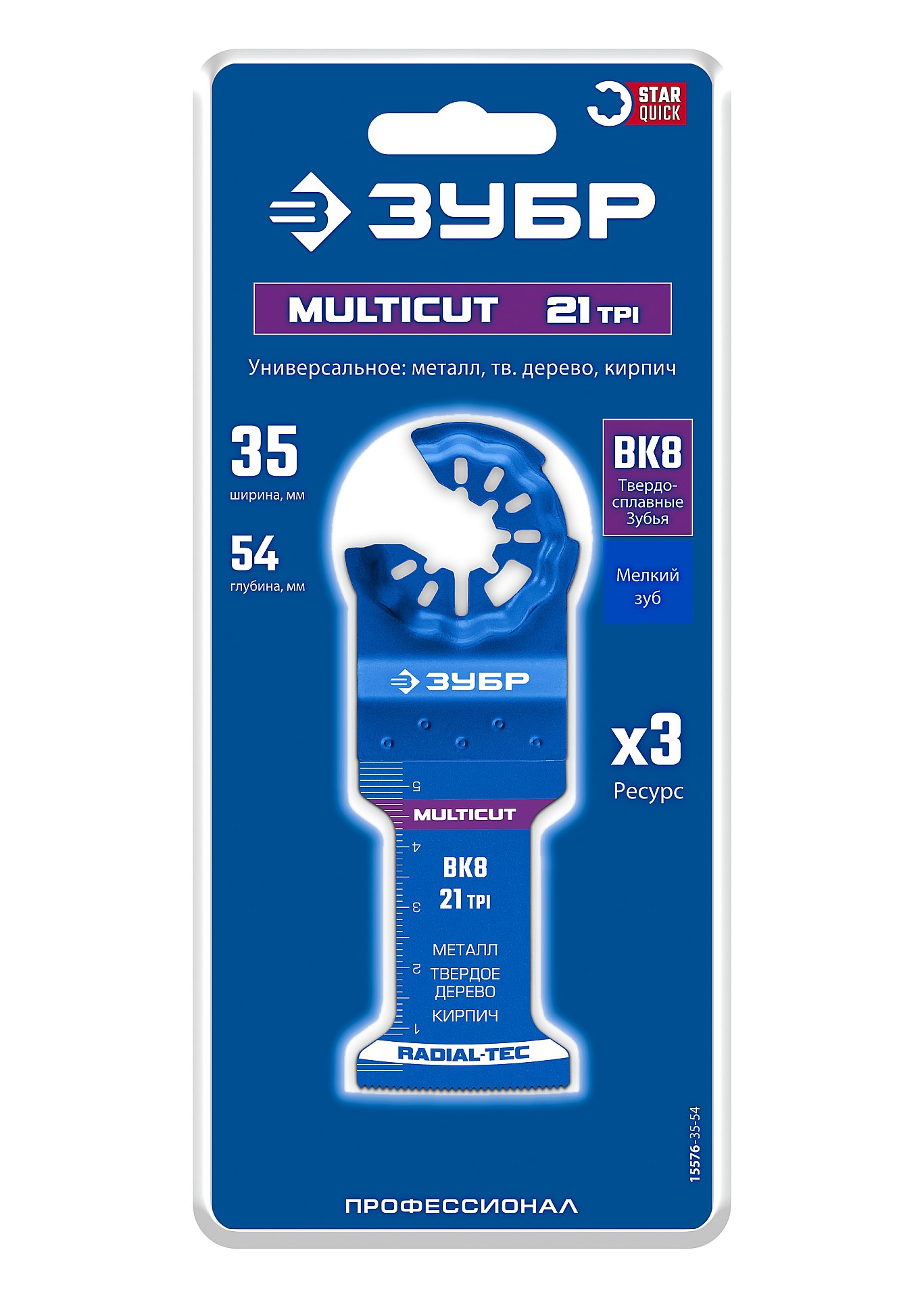 ЗУБР MULTICUT ВК8 21TPI, 35x54 мм полотно универсальное с твердосплавными зубьями: металл, твёрдое дерево, кирпич, StarQuick (15576-35-54)