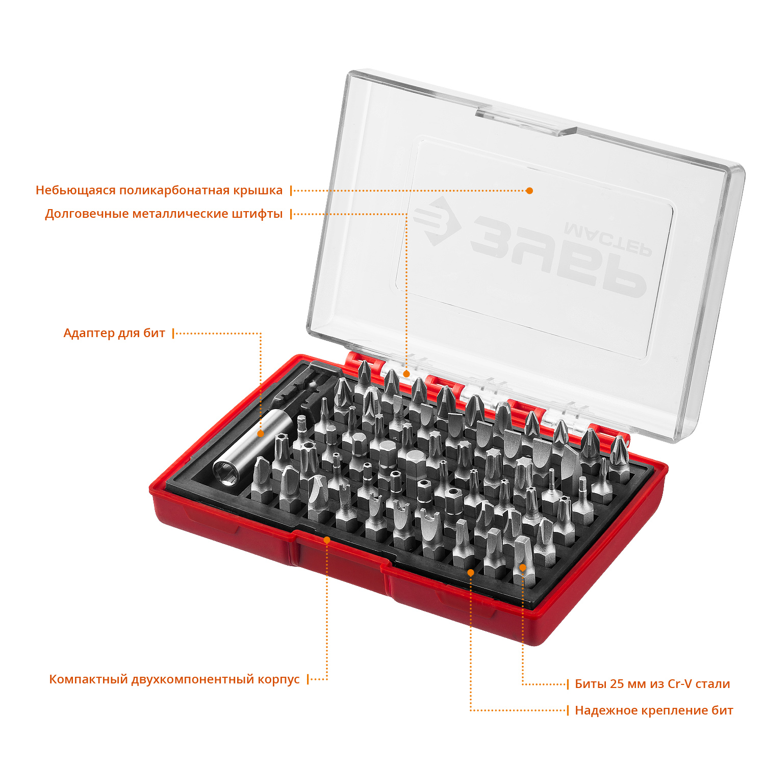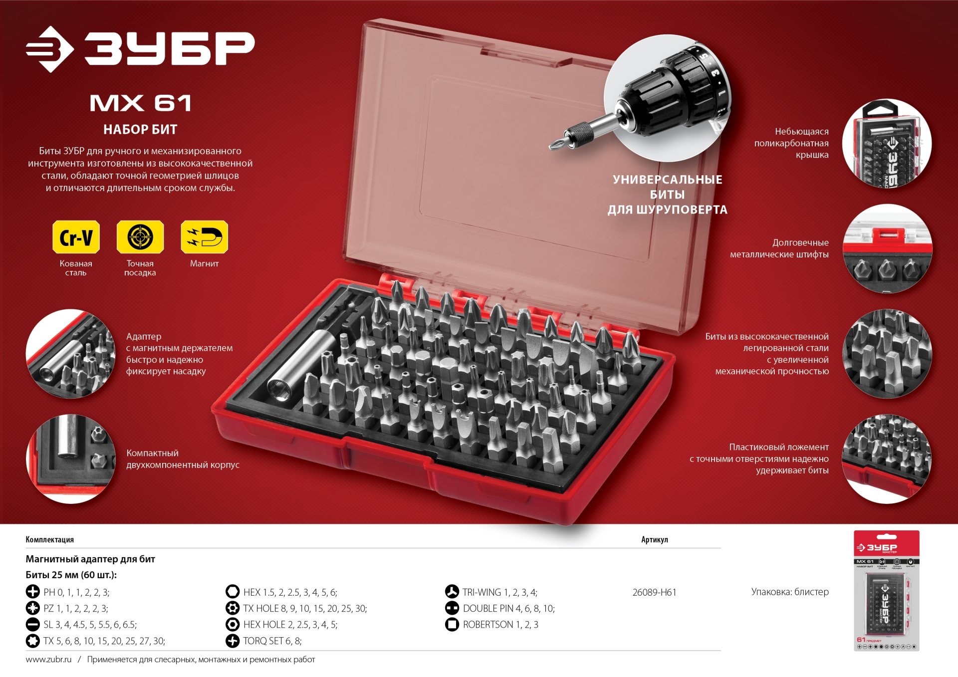 - Биты из высококачественной легированной стали с высокой механической прочностью
