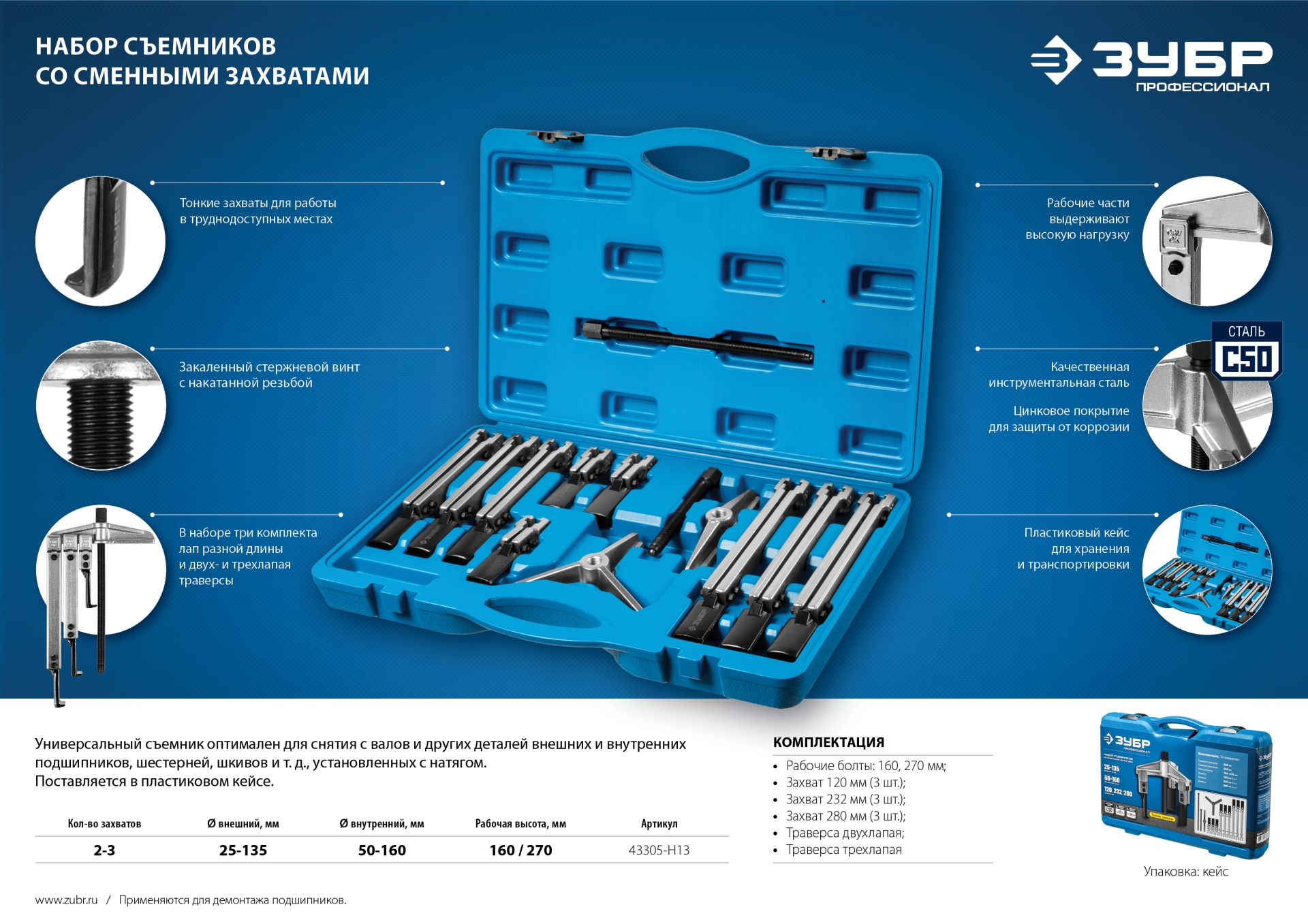 Съемник универсальный, применяется для работы с различными деталями: внутренние и наружные подшипники, шестерни, шкивы и т.д.