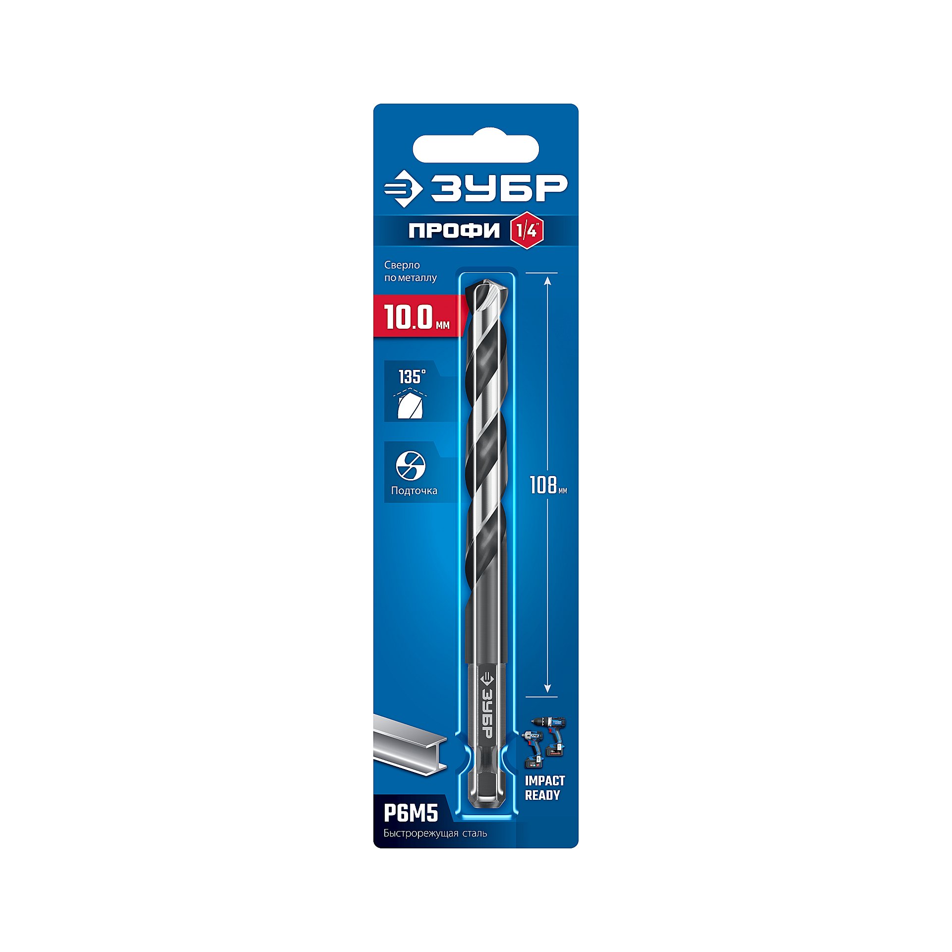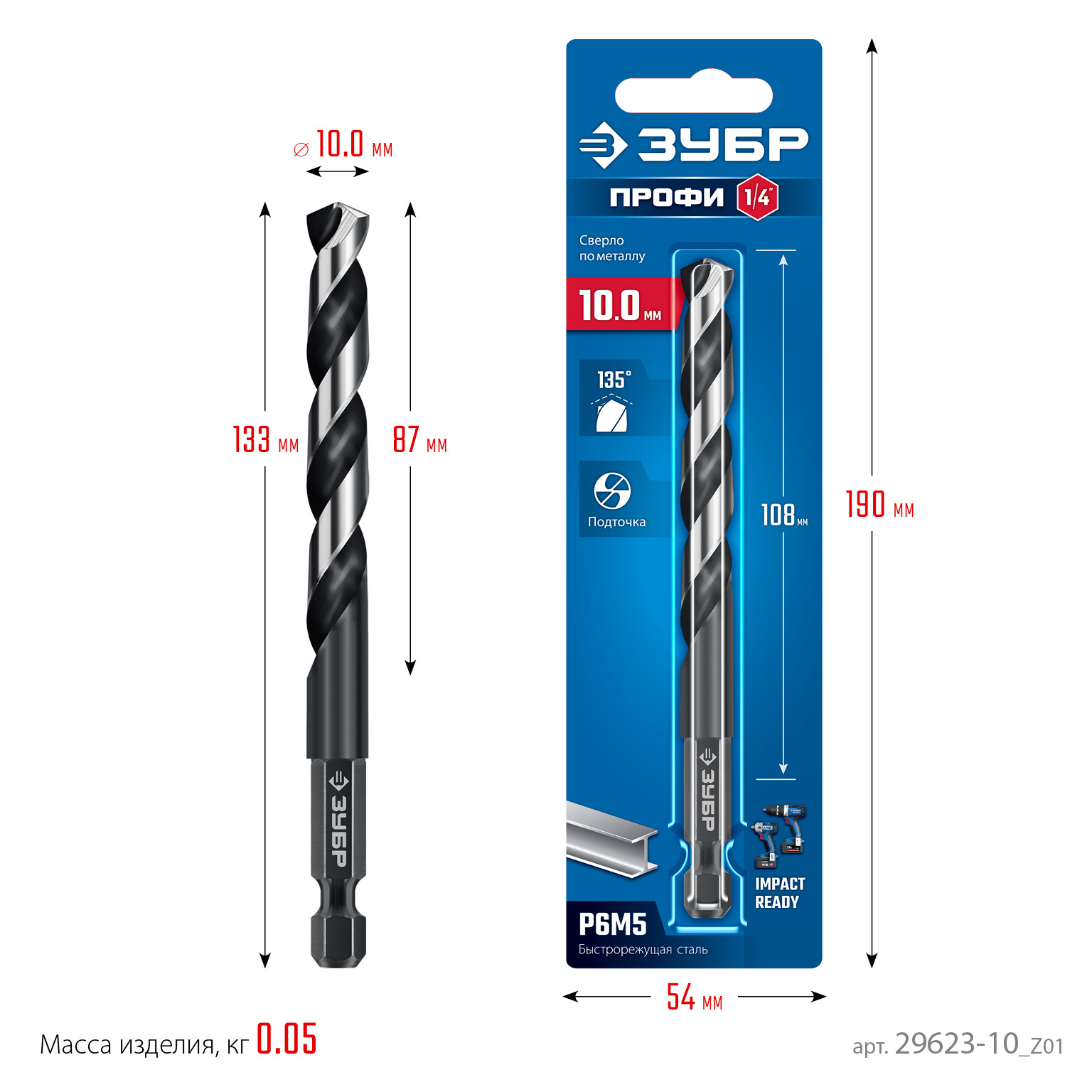 ЗУБР НЕХ-1/4″, d 10.0 х 133 мм, сверло по металлу для винтовёртов и шуруповертов IMPACT READY (29623-10)