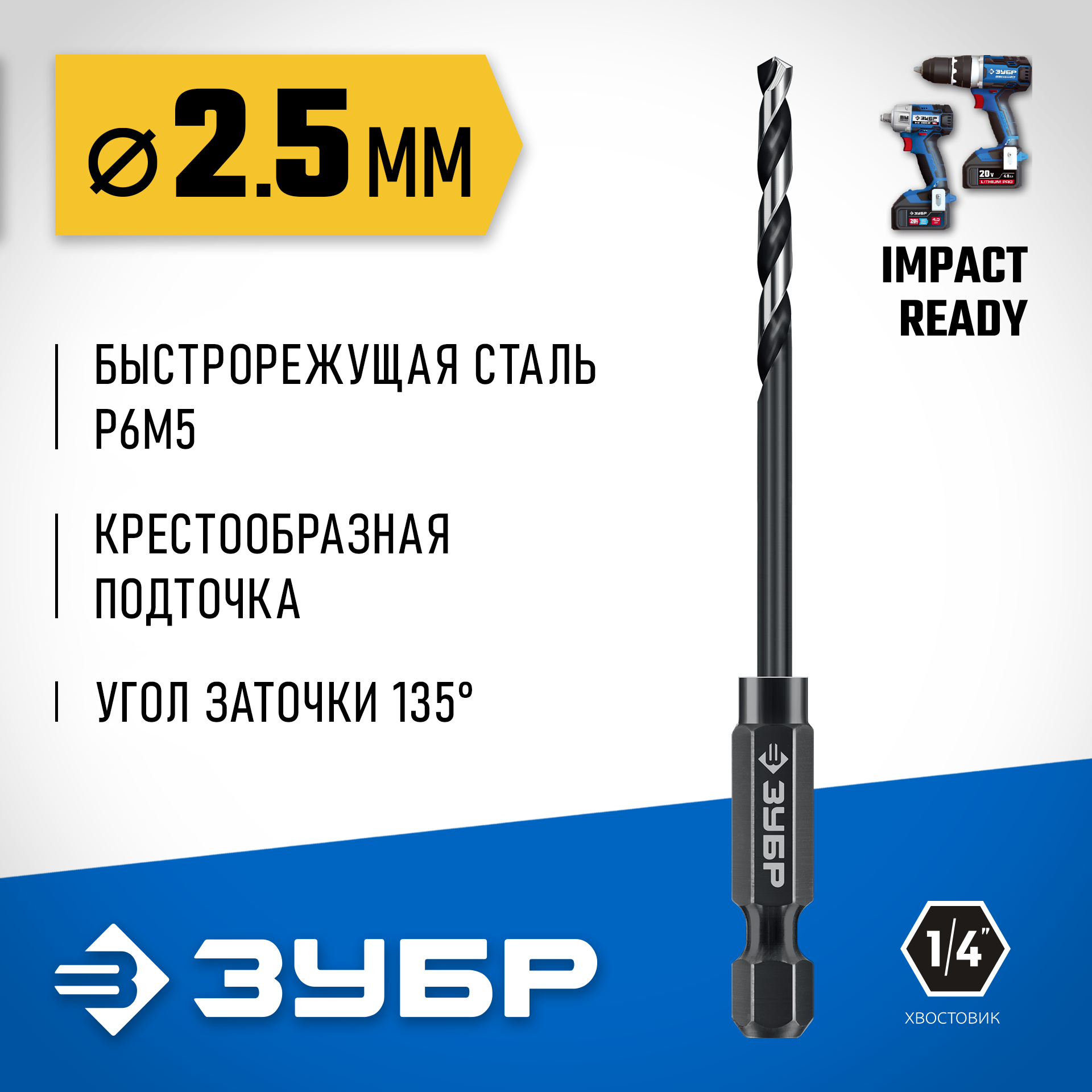 ЗУБР НЕХ-1/4″, d 2.5 х 77 мм, сверло по металлу для винтовёртов и шуруповертов IMPACT READY (29623-2.5)