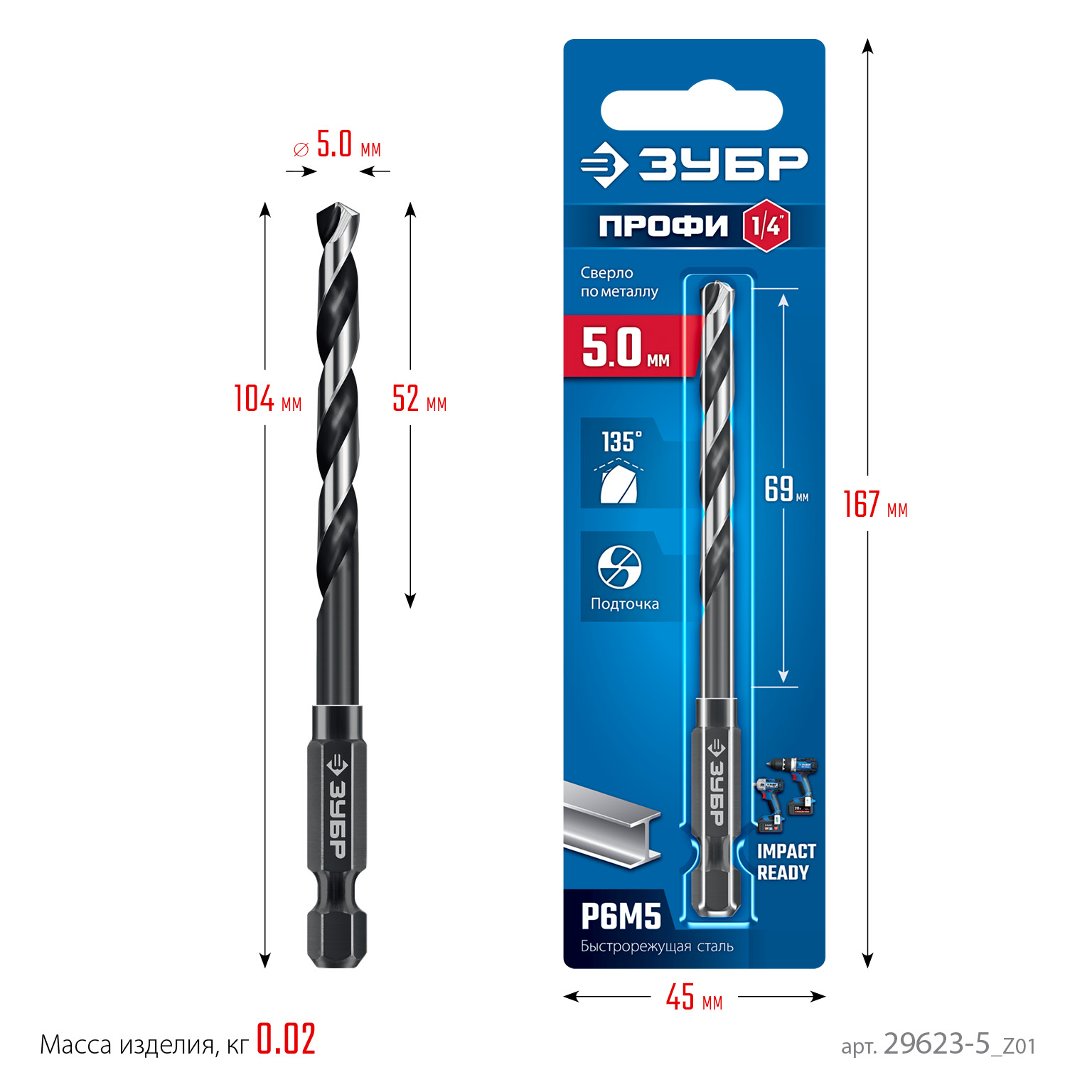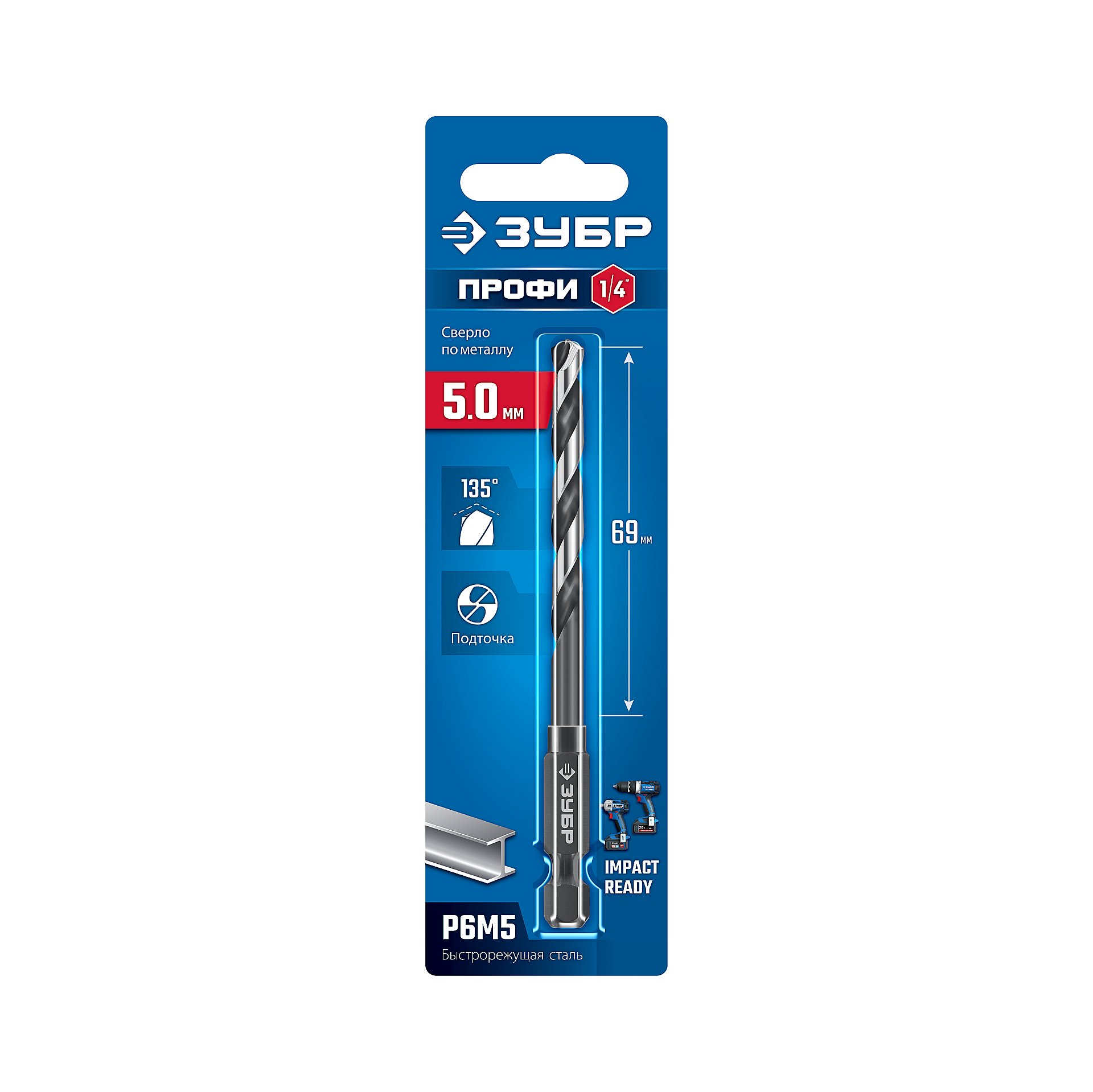 ЗУБР НЕХ-1/4″, d 5.0 х 104 мм, сверло по металлу для винтовёртов и шуруповертов IMPACT READY (29623-5)