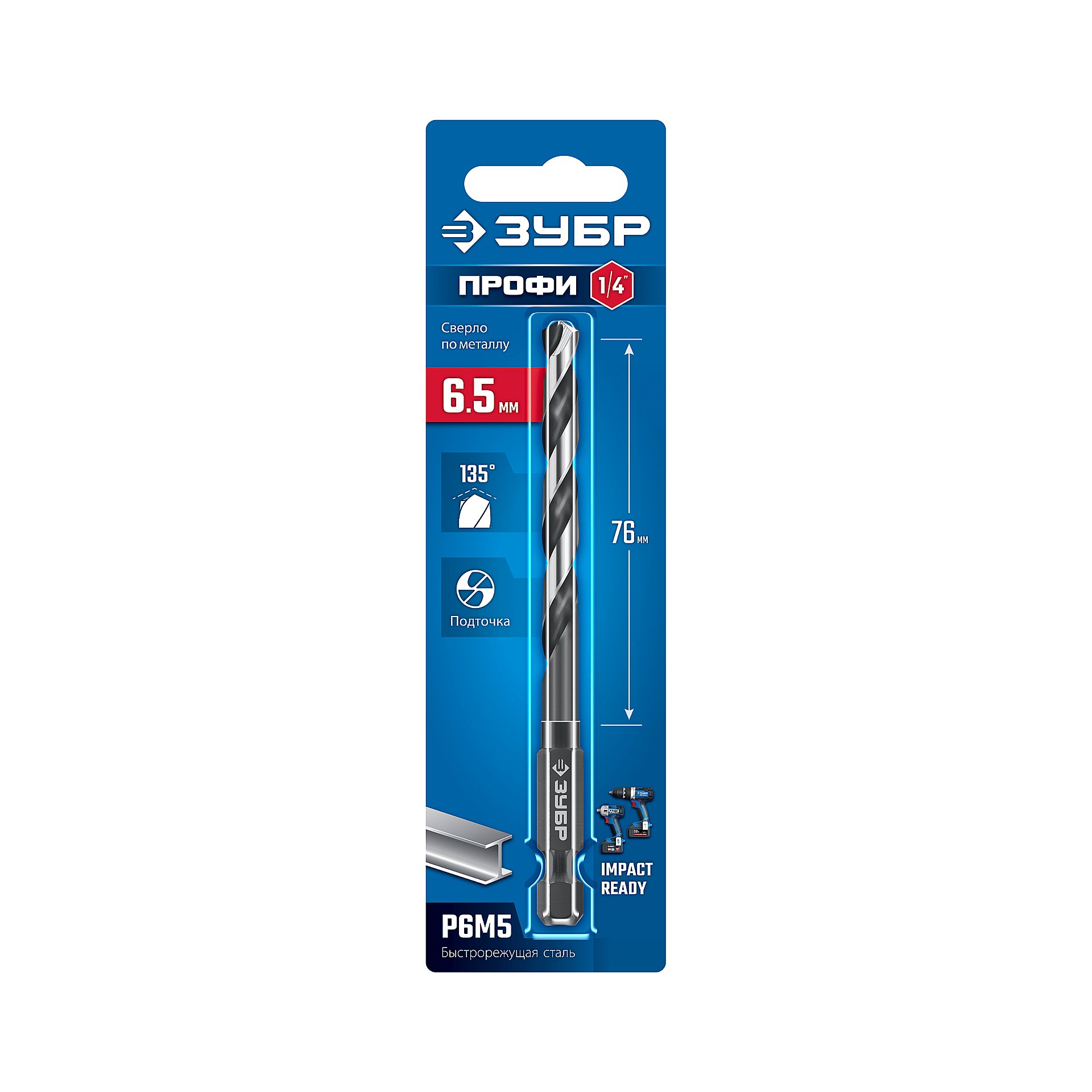 ЗУБР НЕХ-1/4″, d 6.5 х 119 мм, сверло по металлу для винтовёртов и шуруповертов IMPACT READY (29623-6.5)