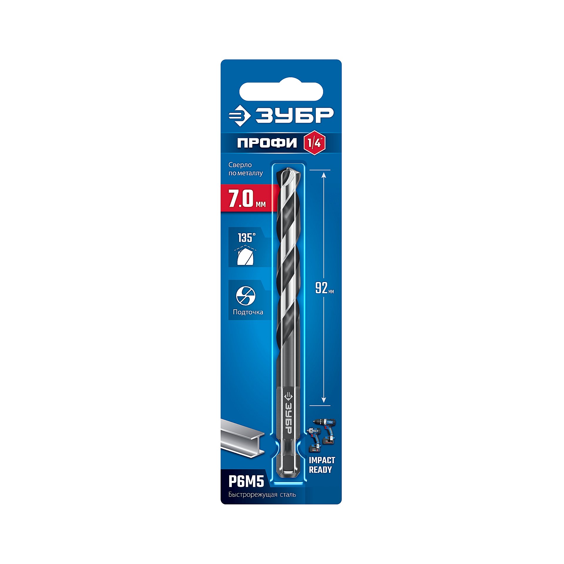 ЗУБР НЕХ-1/4″, d 7.0 х 109 мм, сверло по металлу для винтовёртов и шуруповертов IMPACT READY (29623-7)