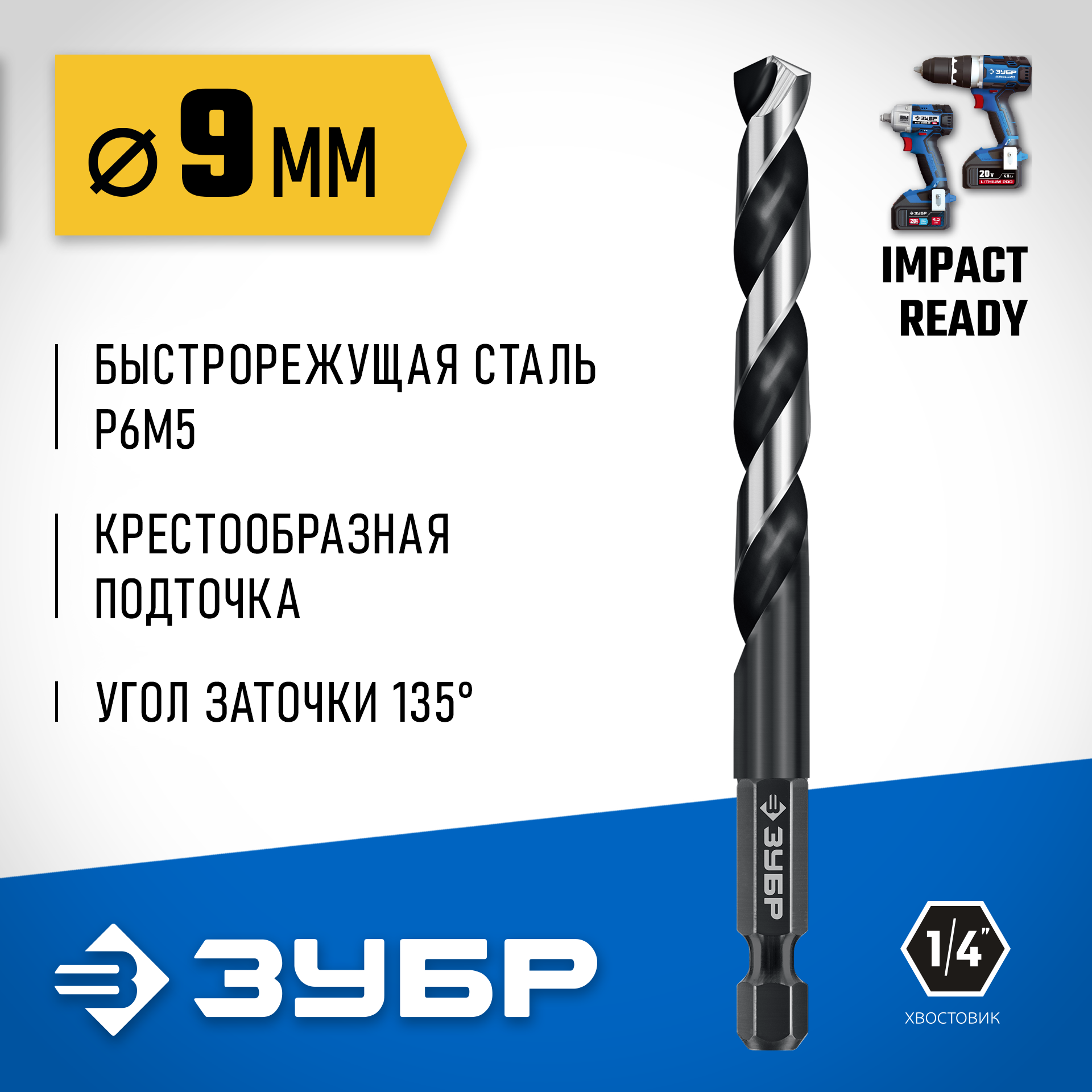 ЗУБР НЕХ-1/4″, d 9.0 х 125 мм, сверло по металлу для винтовёртов и шуруповертов IMPACT READY (29623-9)