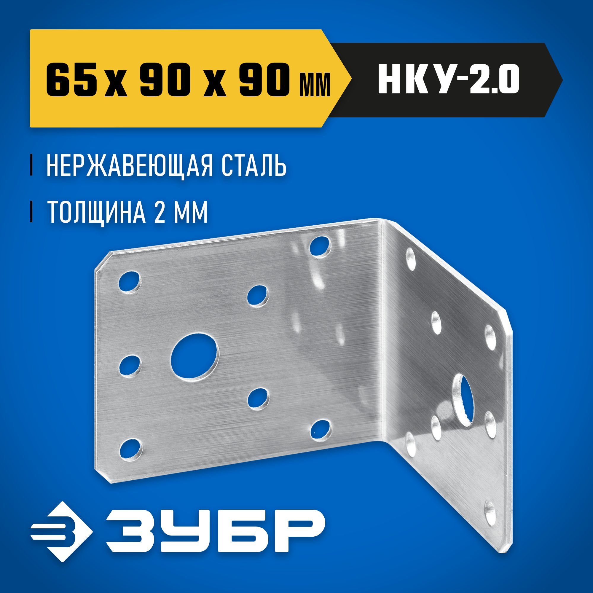 ЗУБР НКУ-2.0, 65 x 90 x 90 x 2 мм, нержавеющий крепежный уголок, Профессионал (310526-65)