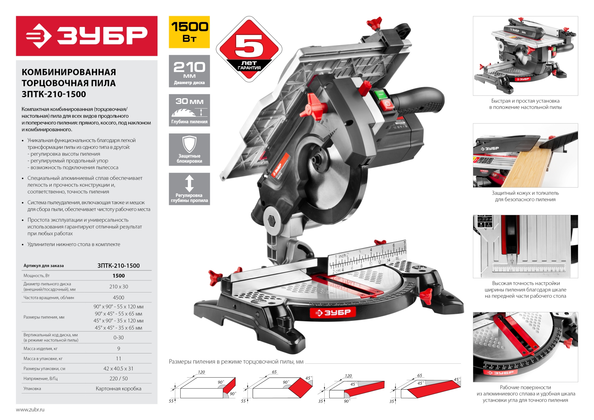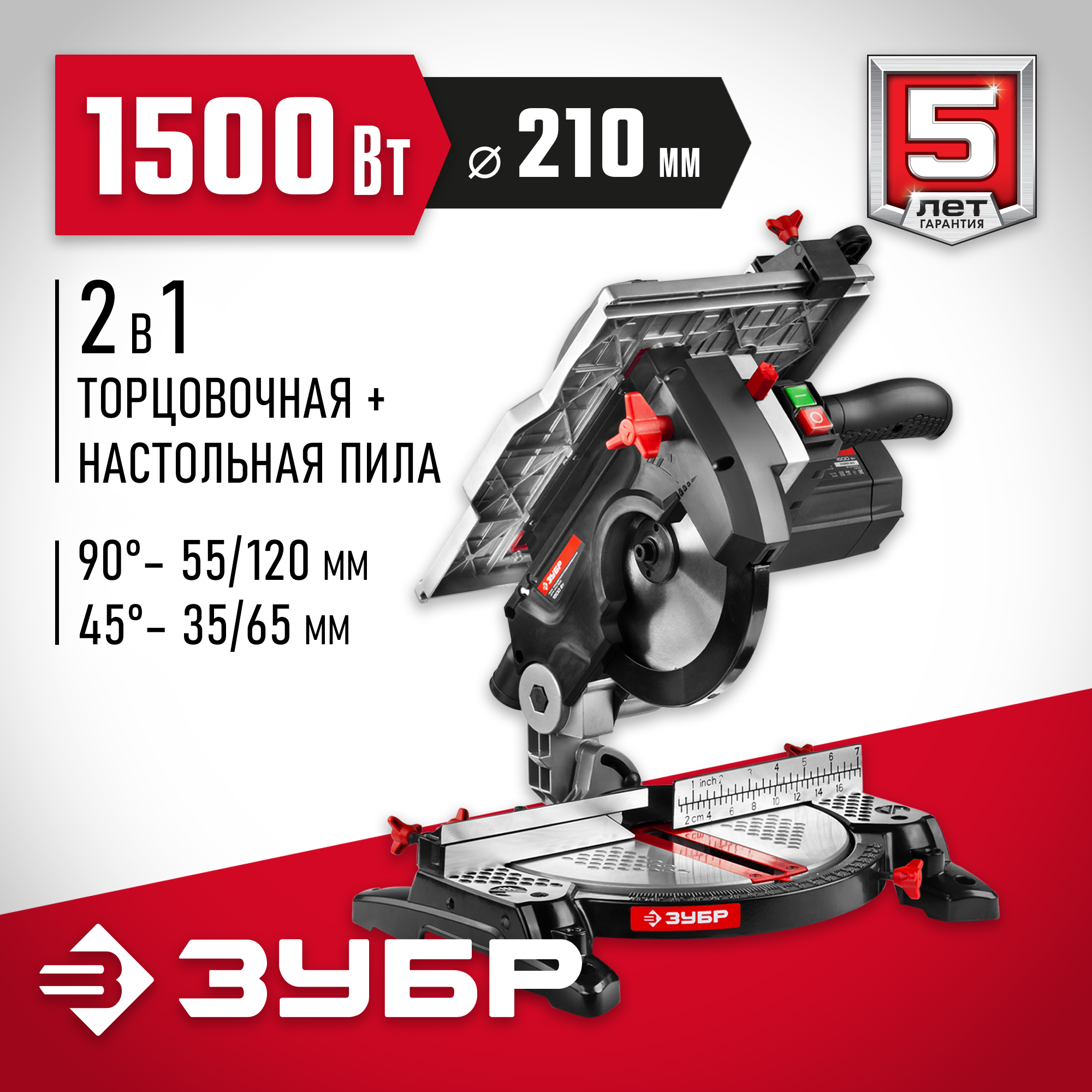 Комбинированная пила ЗПТК-210-1500 2в1 совмещает в себе две пилы (настольную и торцовочную) с сохранением преимуществ обеих. Из одного типа в другой изделие переводится буквально в два действия - так же просто, как и работа с ним. Различные режимы пиления, точность пропила, защитные блокировки и качество изготовления - то, что нужно для отличного результата.