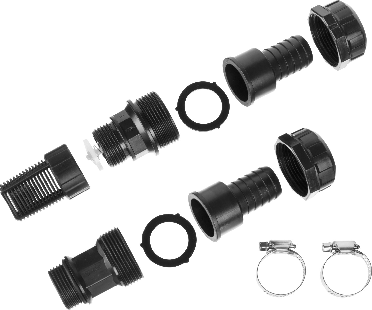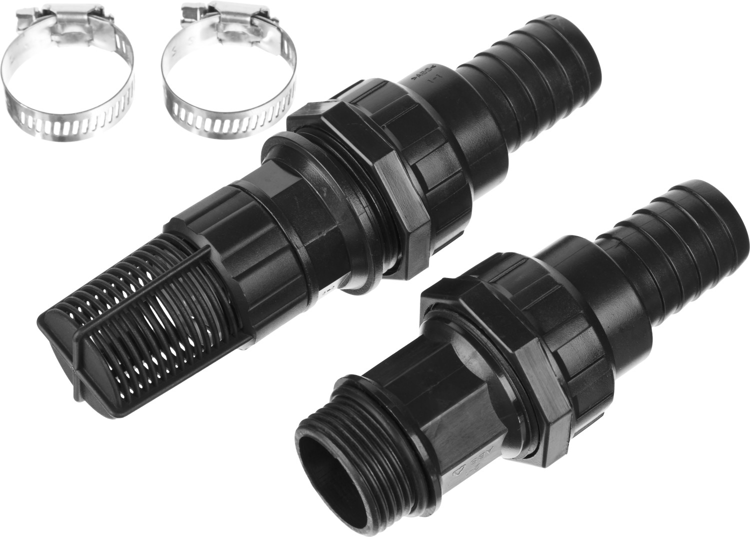 Набор арматуры позволяет собрать комплект для откачки воды из различных водоёмов. Подходит к всасывающим шлангам с внутренним диаметром 1″, подключается к насосу с помощью резьбового соединения 1″. Состоит из обратного клапана с фильтром для воды, адаптера для подключению к насосу и двух хомутов. Фитинги из ударопрочного пластика и хомуты из нержавеющей стали обеспечивают высокую надёжность соединений и гарантирует продолжительный срок службы изделия.