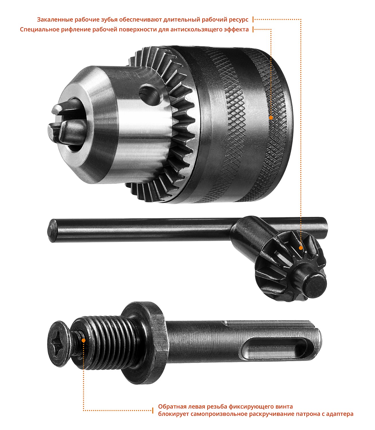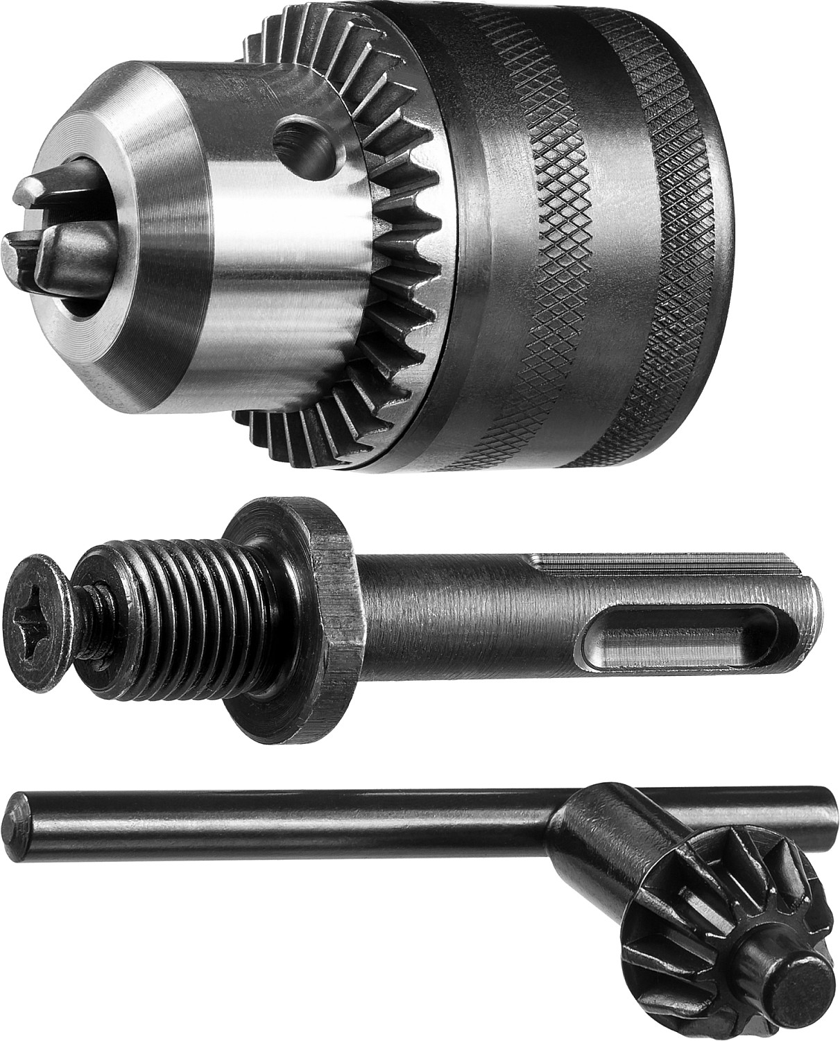 Набор применяется для зажима сверл, буров, концевых фрез и другого режущего инструмента с цилиндрическим, трёх- и шестигранным хвостовиком во всех типах ударных электрических и аккумуляторных, а также лёгких перфораторах с системой крепления ″SDS+″