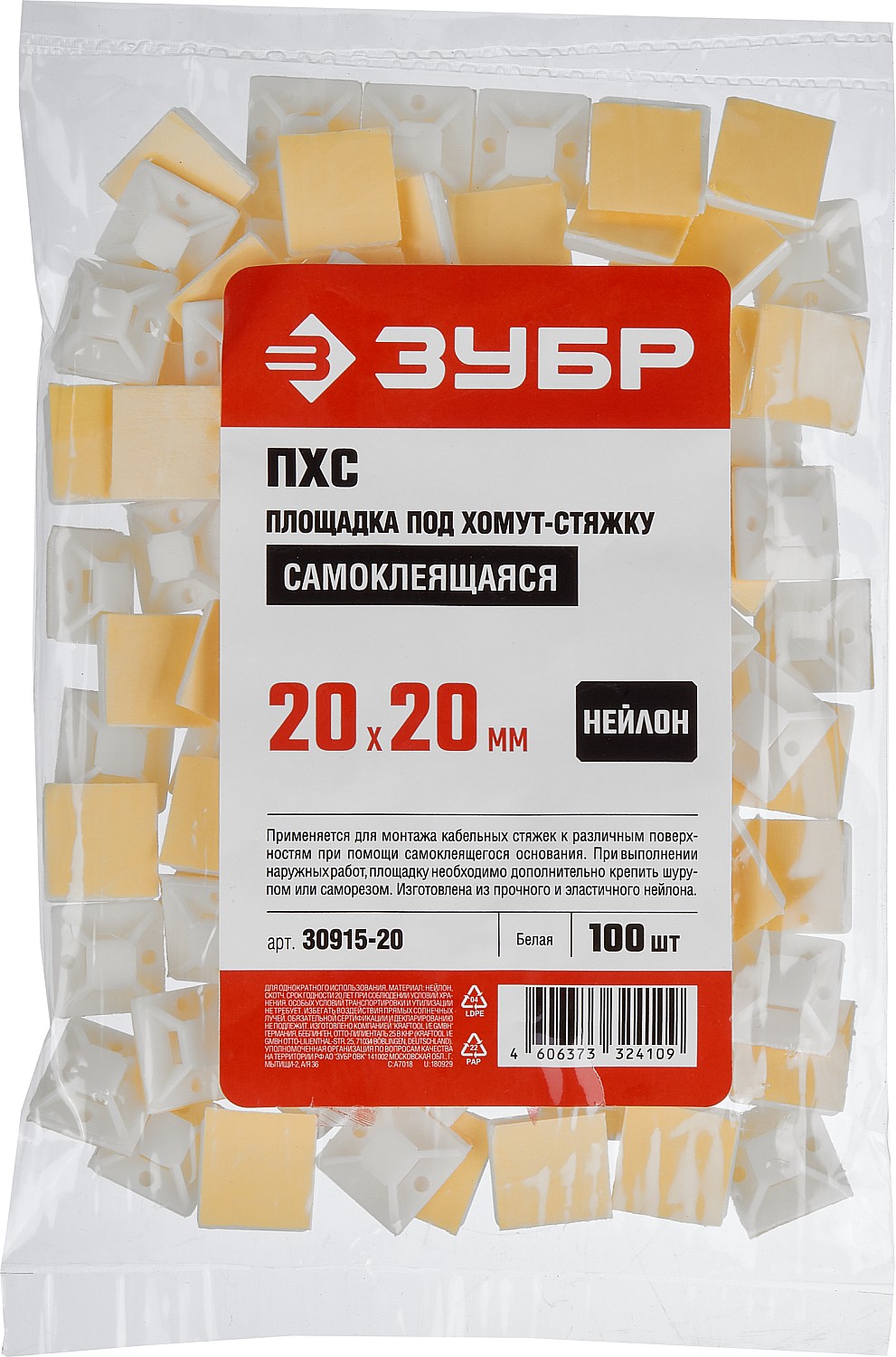 ЗУБР ПХС, 20 x 20 мм, нейлон, 100 шт, белая, самоклеющаяся площадка под хомут-стяжку (30915-20)