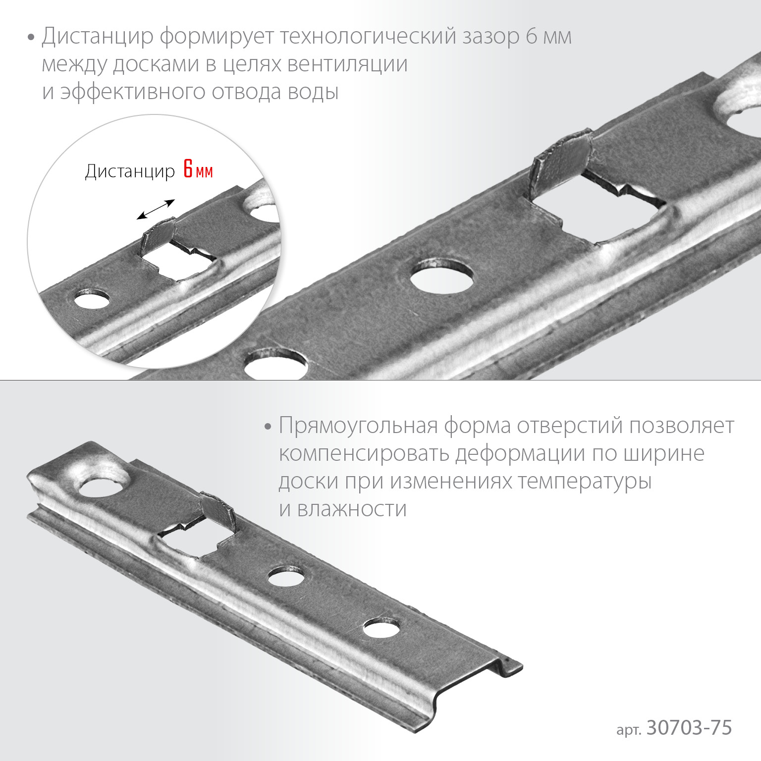 - Дистанцир формирует зазор 6 мм между досками. Зазор необходим для вентиляции покрытия и его устойчивости к температурным колебаниям.