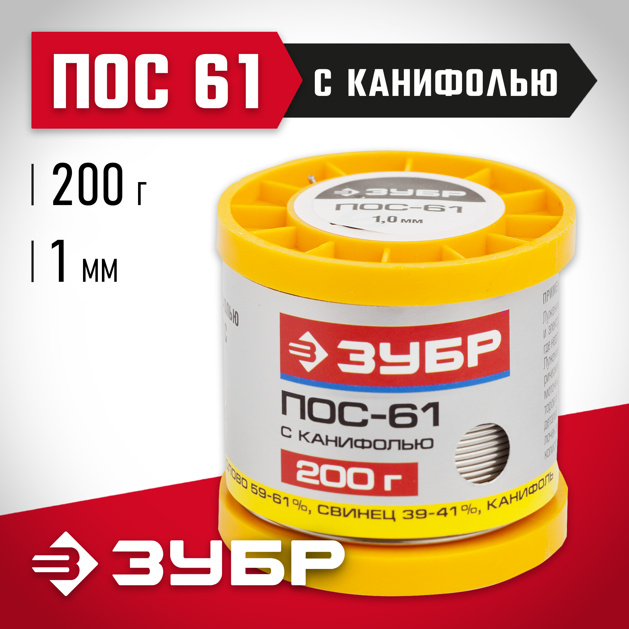 Припой ПОС 61 Зубр 55450-200-10C применяется для лужения и пайки элементов электро- и радиоаппаратуры, печатных схем, точных приборов с герметичными швами, где недопустим перегрев, пайка жести, обмоток электрических машин, монтажных элементов, моточных и кабельных изделий, радиаторов и листового цинка, оцинкованных деталей холодильных агрегатов, теплообменников, электроламп, кабельных оболочек, тонколистовой упаковки. Припой с 61% содержанием олова и 39% содержанием свинца оптимально подходит в случаях, когда элементы для спайки нельзя перегревать. Продукция предназначена для профессионального использования. Припой имеет высший уровень качества и прошёл спектральную и химическую проверку. Соответствует ГОСТ 21931-76.