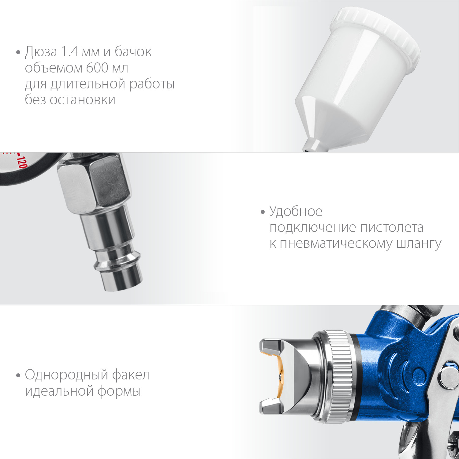- Дюза 1,4 мм и бачок объемом 600 мл - возможность длительной работы без остановки