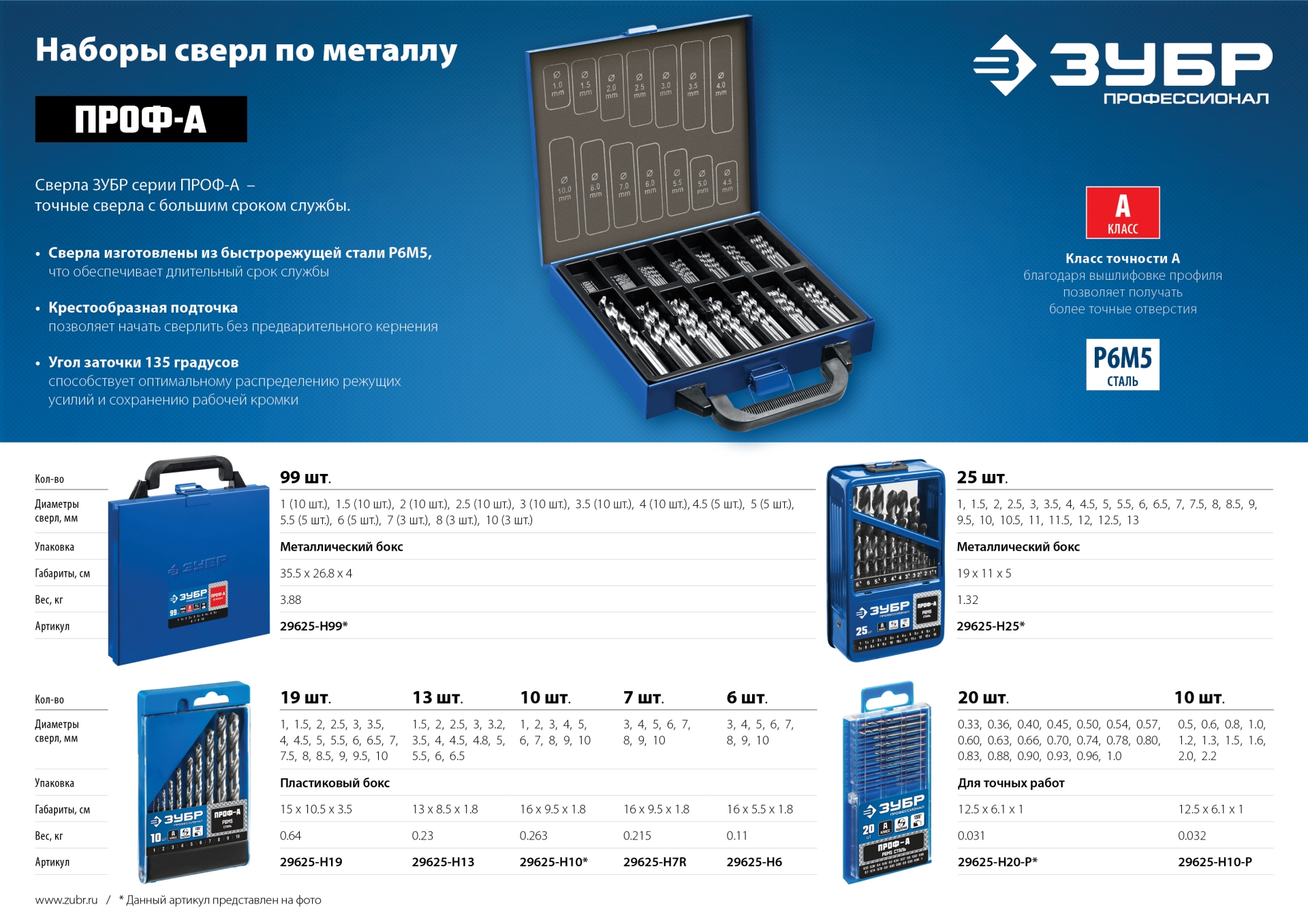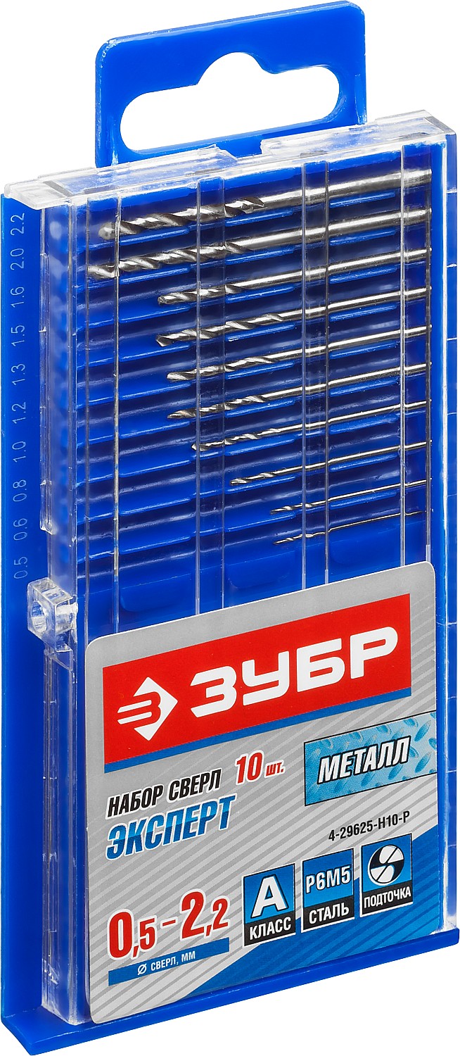 ЗУБР ПРОФ-А, 10 шт, (0.5-2.2 мм), сталь Р6М5, класс А, для печатных плат, набор сверл по металлу, Профессионал (29625-H10-P)