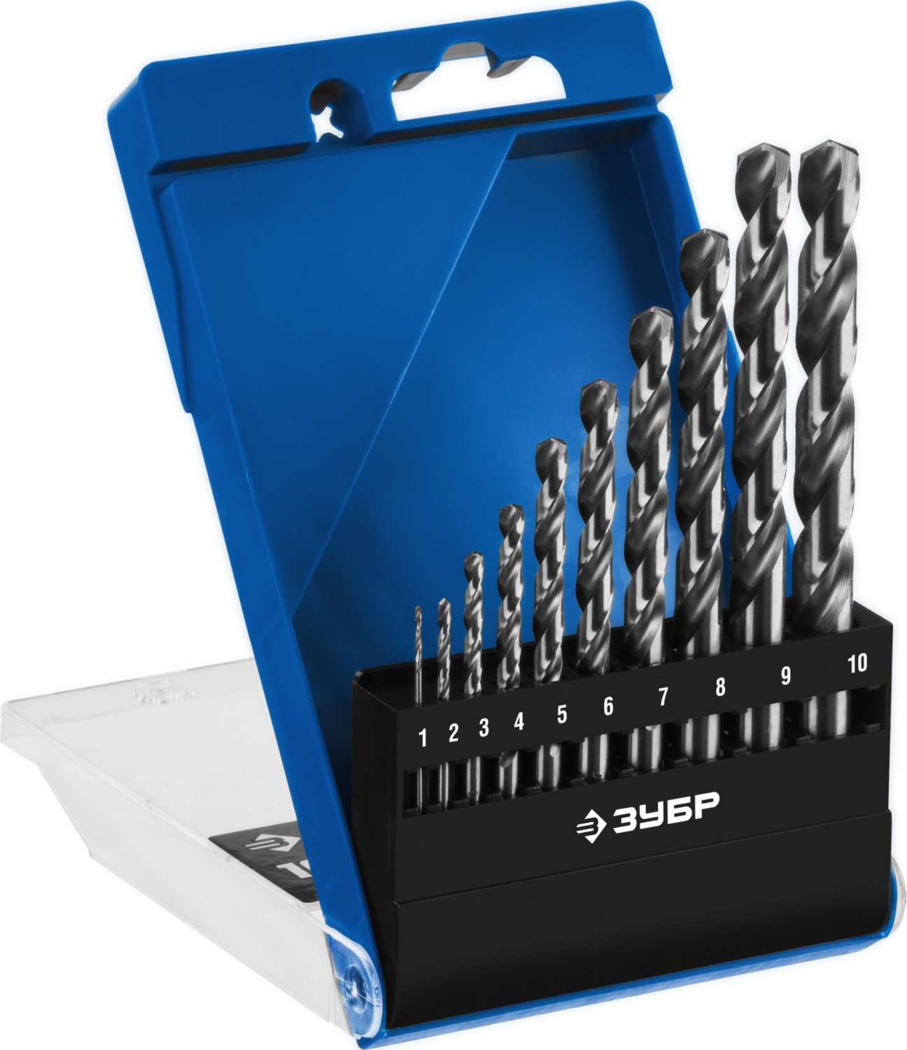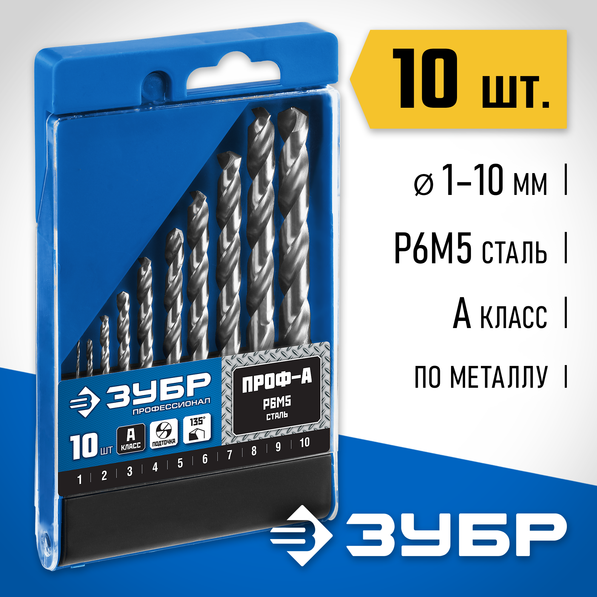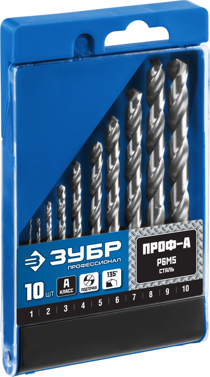 ЗУБР ПРОФ-А, 10 шт, (1-10 мм), сталь Р6М5, класс А, набор сверл по металлу, Профессионал (29625-H10)