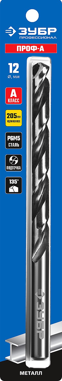 ЗУБР ПРОФ-А, 12.0 х 205 мм, сталь Р6М5, класс А, удлиненное сверло по металлу, Профессионал (29624-12)