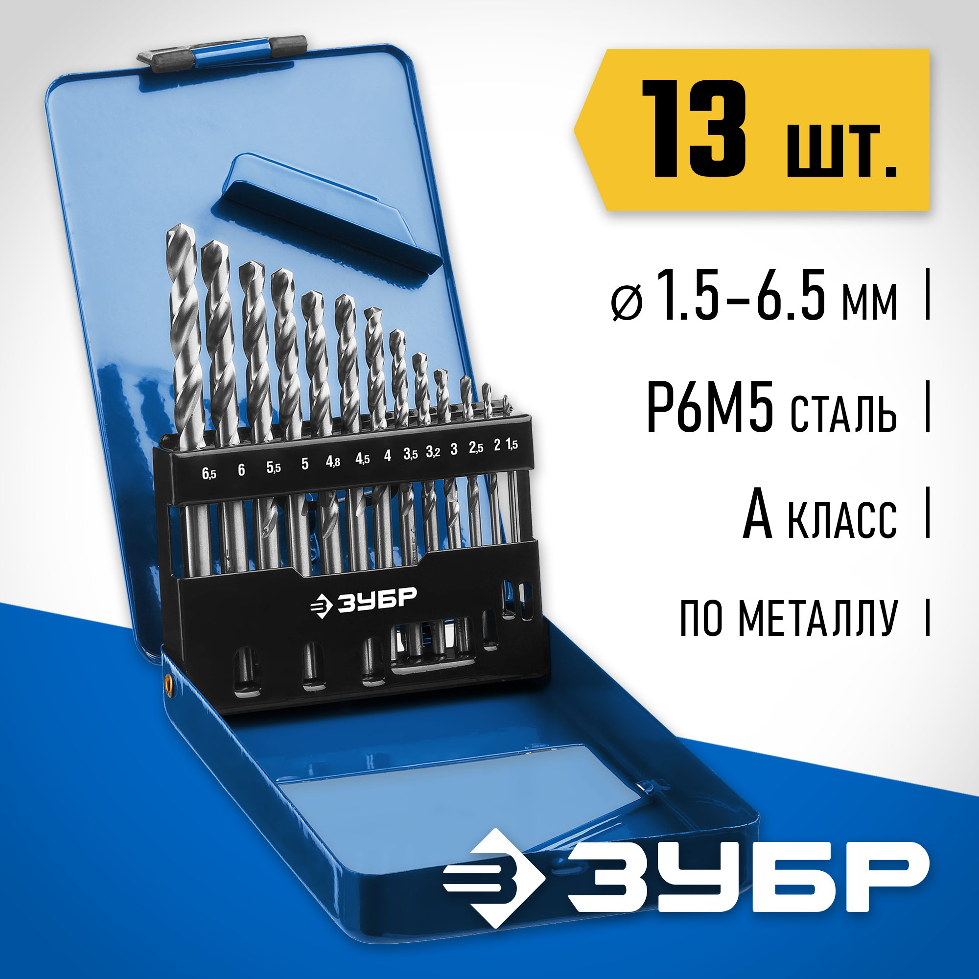 ЗУБР ПРОФ-А, 13 шт, (1.5-6.5 мм), сталь Р6М5, класс А, мет.бокс, набор сверл по металлу, Профессионал (29625-H13)