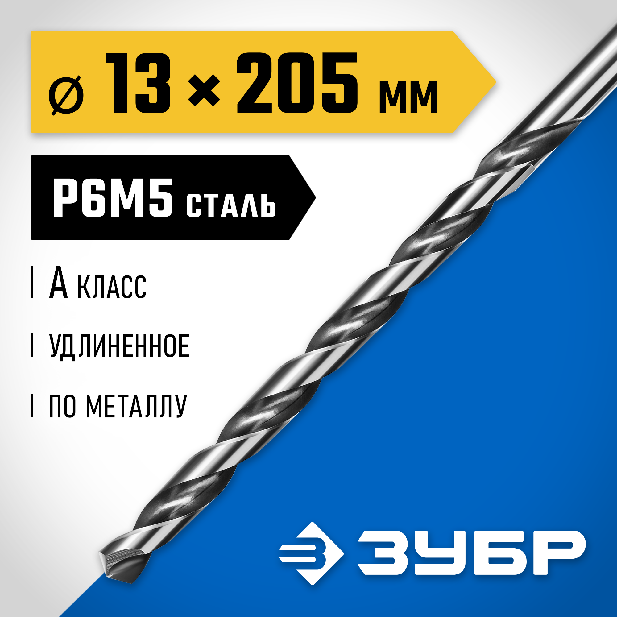 ЗУБР ПРОФ-А, 13.0 х 205 мм, сталь Р6М5, класс А, удлиненное сверло по металлу, Профессионал (29624-13)