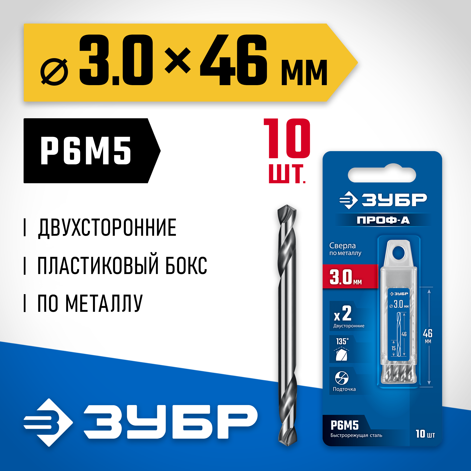 ЗУБР Проф-А 3.0х46мм, сверло двухстороннее по металлу, сталь Р6М5, класс А, 10шт, Профессионал (29627-3.0-10)