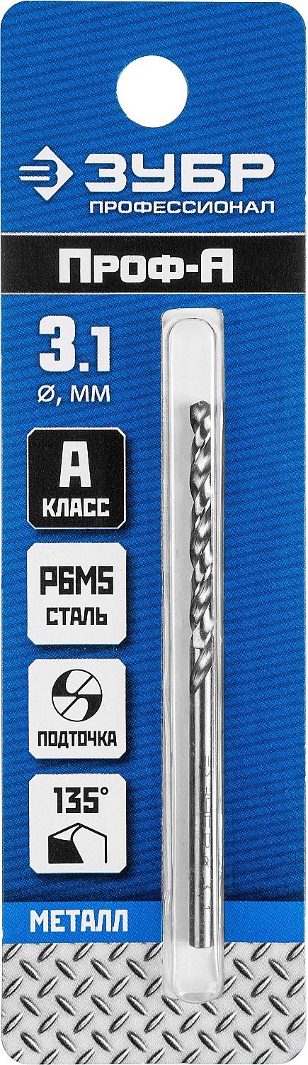 ЗУБР ПРОФ-А, 3.1 х 65 мм, сталь Р6М5, класс А, сверло по металлу, Профессионал (29625-3.1)