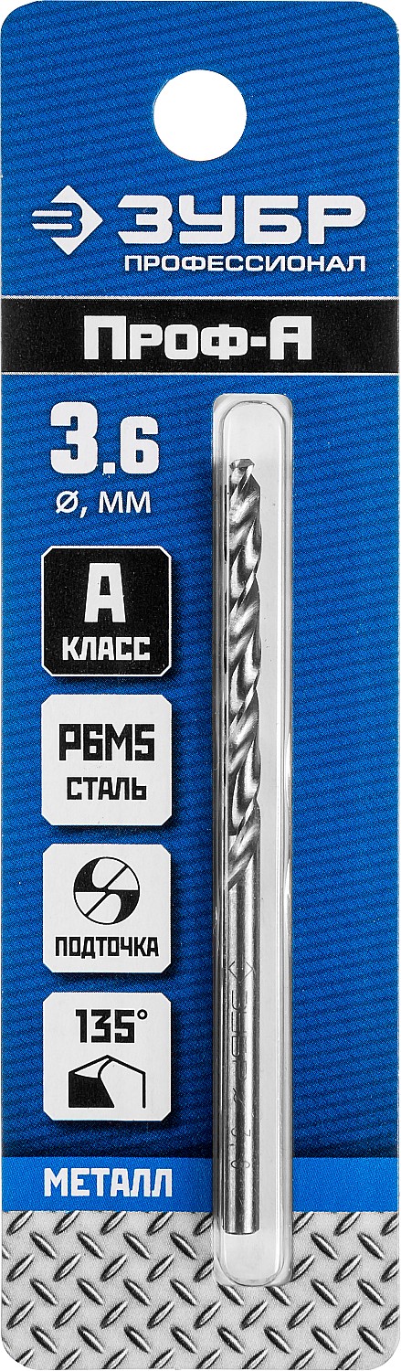 ЗУБР ПРОФ-А, 3.6 х 70 мм, сталь Р6М5, класс А, сверло по металлу, Профессионал (29625-3.6)