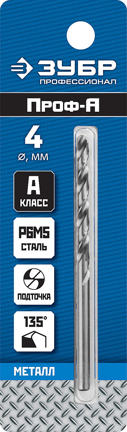 ЗУБР ПРОФ-А, 4.0 х 75 мм, сталь Р6М5, класс А, сверло по металлу, Профессионал (29625-4)