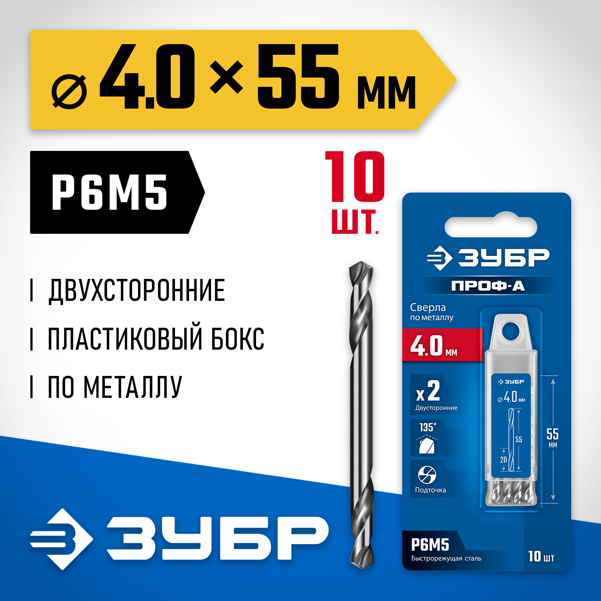 ЗУБР Проф-А 4.0х55мм, сверло двухстороннее по металлу, сталь Р6М5, класс А, 10шт, Профессионал (29627-4.0-10)