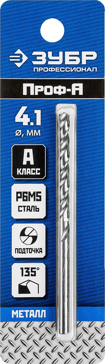ЗУБР ПРОФ-А, 4.1 х 75 мм, сталь Р6М5, класс А, сверло по металлу, Профессионал (29625-4.1)