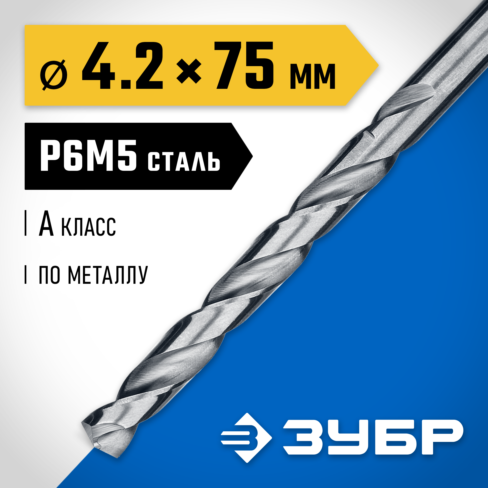 ЗУБР ПРОФ-А, 4.2 х 75 мм, сталь Р6М5, класс А, сверло по металлу, Профессионал (29625-4.2)