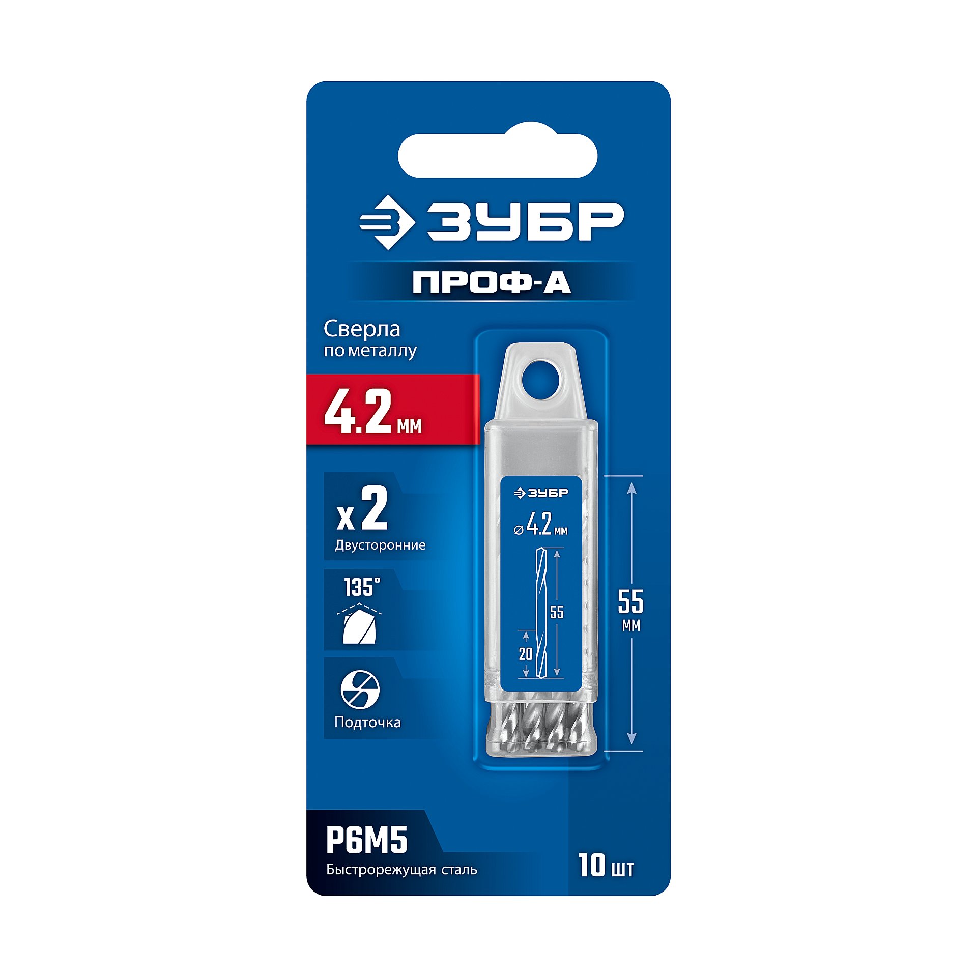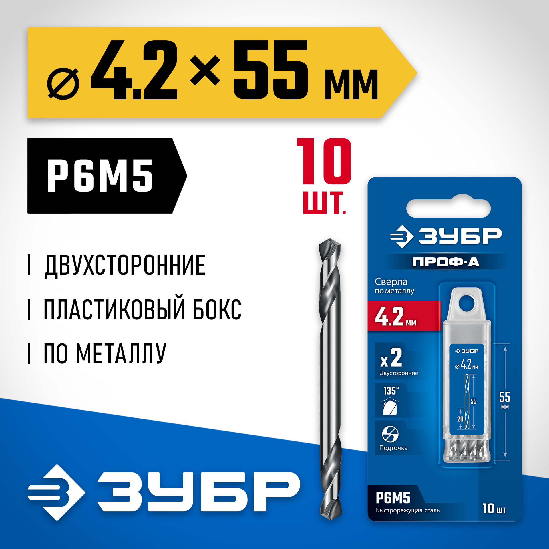 ЗУБР Проф-А 4.2х55мм, сверло двухстороннее по металлу, сталь Р6М5, класс А, 10шт, Профессионал (29627-4.2-10)