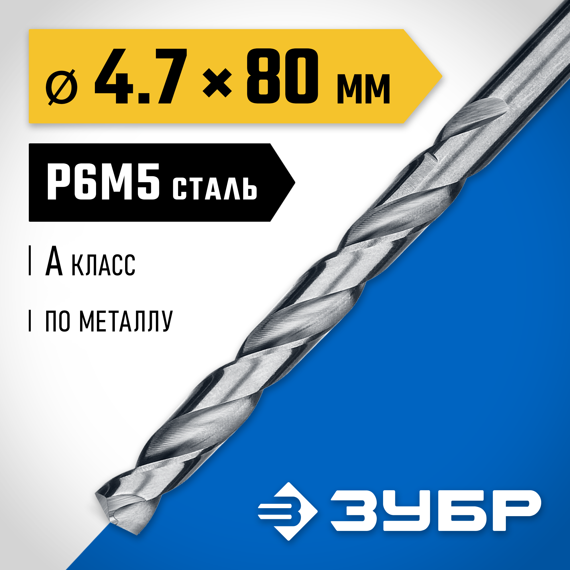 ЗУБР ПРОФ-А, 4.7 х 80 мм, сталь Р6М5, класс А, сверло по металлу, Профессионал (29625-4.7)