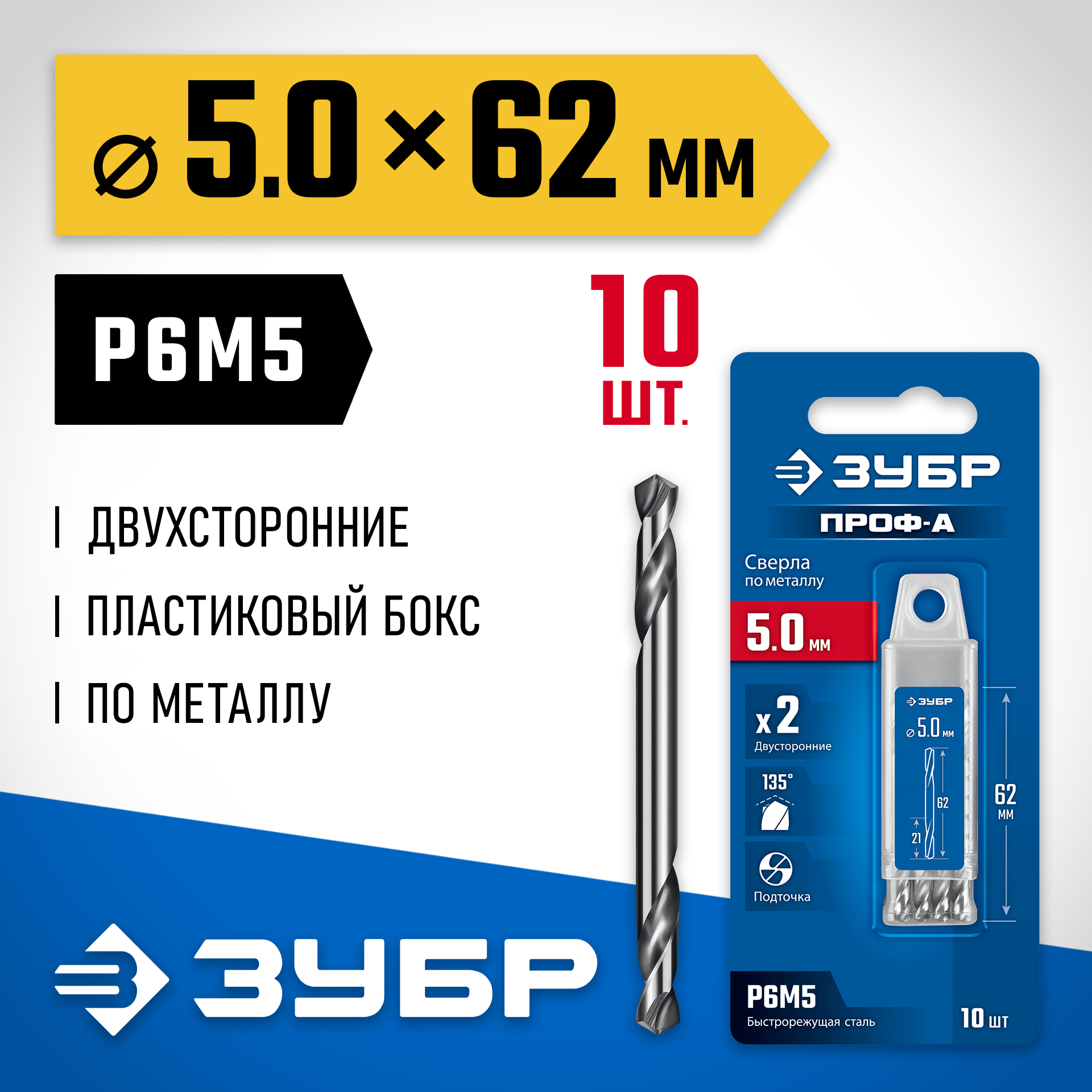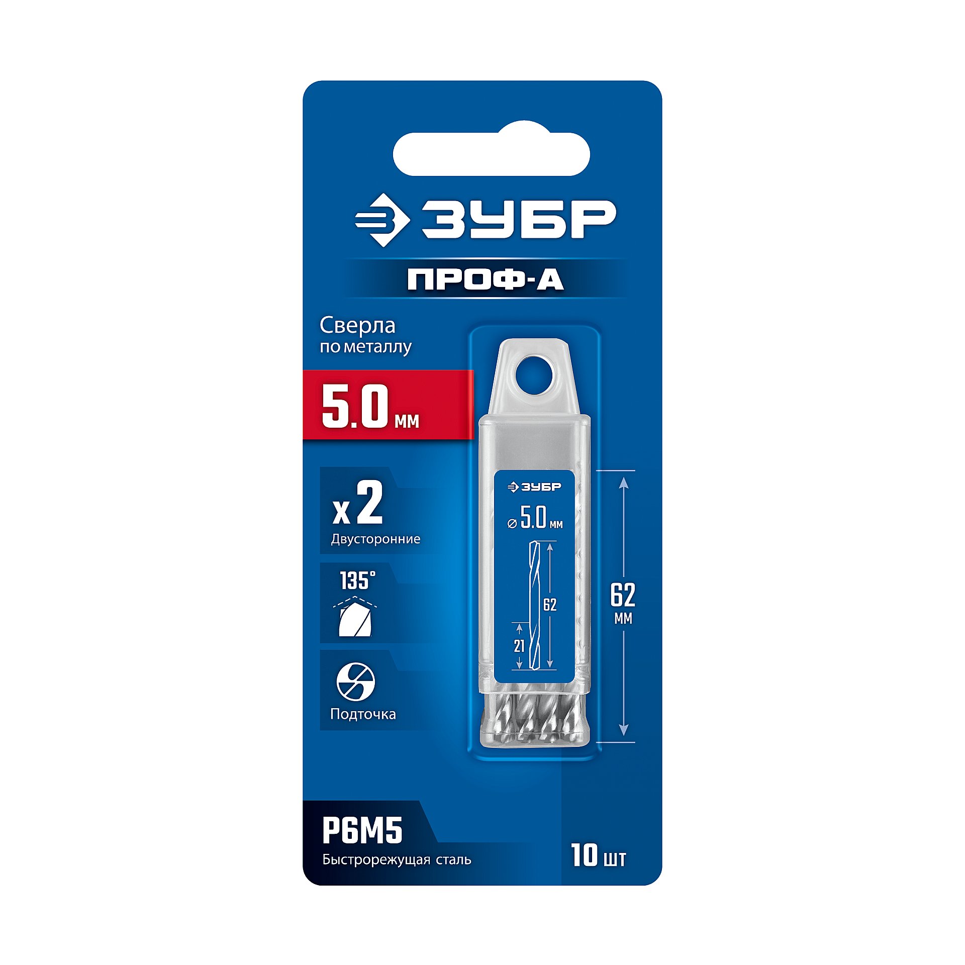 ЗУБР Проф-А 5.0х62мм, сверло двухстороннее по металлу, сталь Р6М5, класс А, 10шт, Профессионал (29627-5.0-10)
