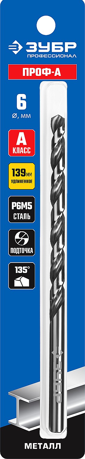 ЗУБР ПРОФ-А, 6.0 х 139 мм, сталь Р6М5, класс А, удлиненное сверло по металлу, Профессионал (29624-6)