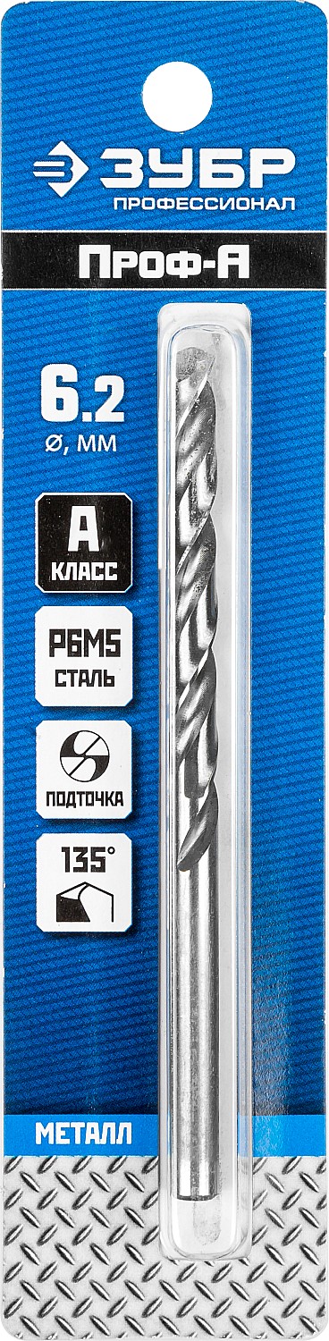 ЗУБР ПРОФ-А, 6.2 х 101 мм, сталь Р6М5, класс А, сверло по металлу, Профессионал (29625-6.2)