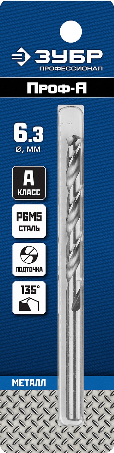ЗУБР ПРОФ-А, 6.3 х 101 мм, сталь Р6М5, класс А, сверло по металлу, Профессионал (29625-6.3)