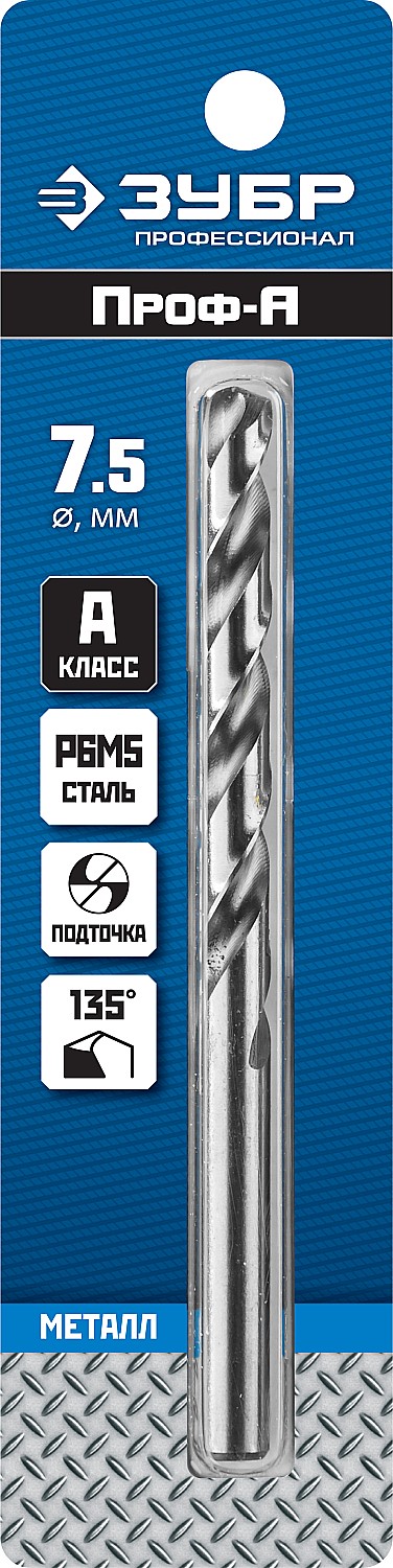 ЗУБР ПРОФ-А, 7.5 х 109 мм, сталь Р6М5, класс А, сверло по металлу, Профессионал (29625-7.5)