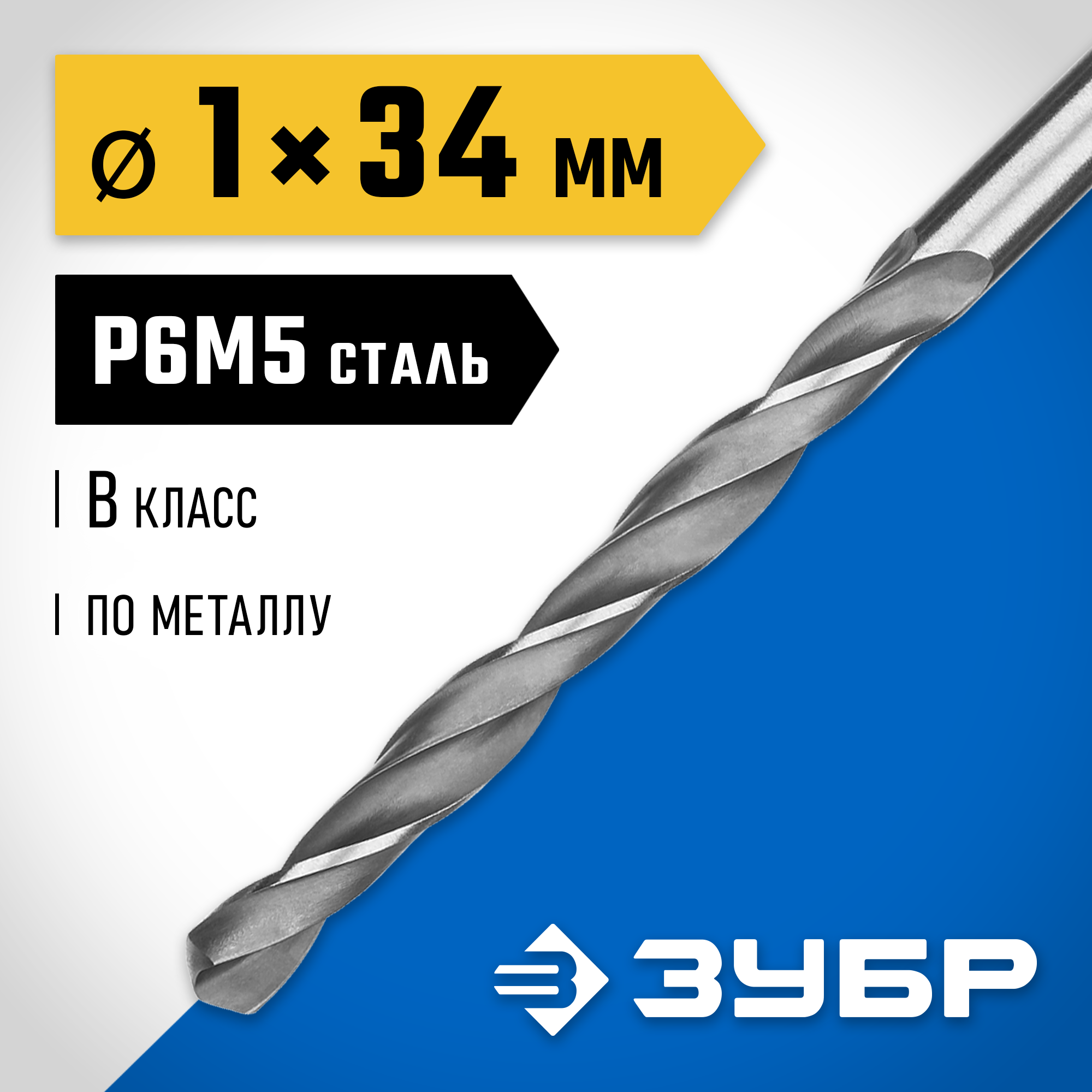 ЗУБР ПРОФ-В, 1.0 х 34 мм, сталь Р6М5, класс В, сверло по металлу, Профессионал (29621-1)