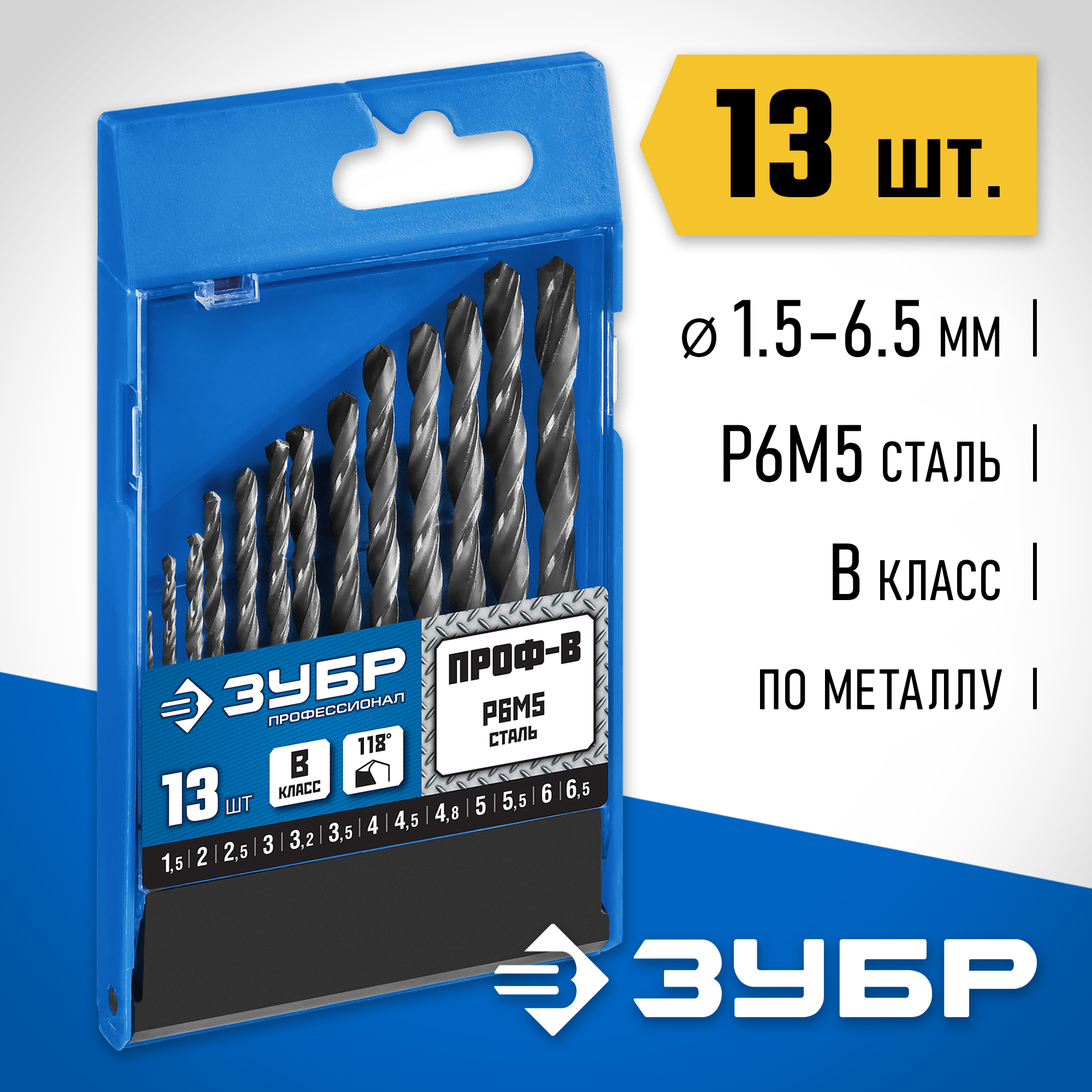 ЗУБР ПРОФ-В, 13 шт, (1.5-6.5 мм), сталь Р6М5, класс В, набор сверл по металлу, Профессионал (29621-H13)