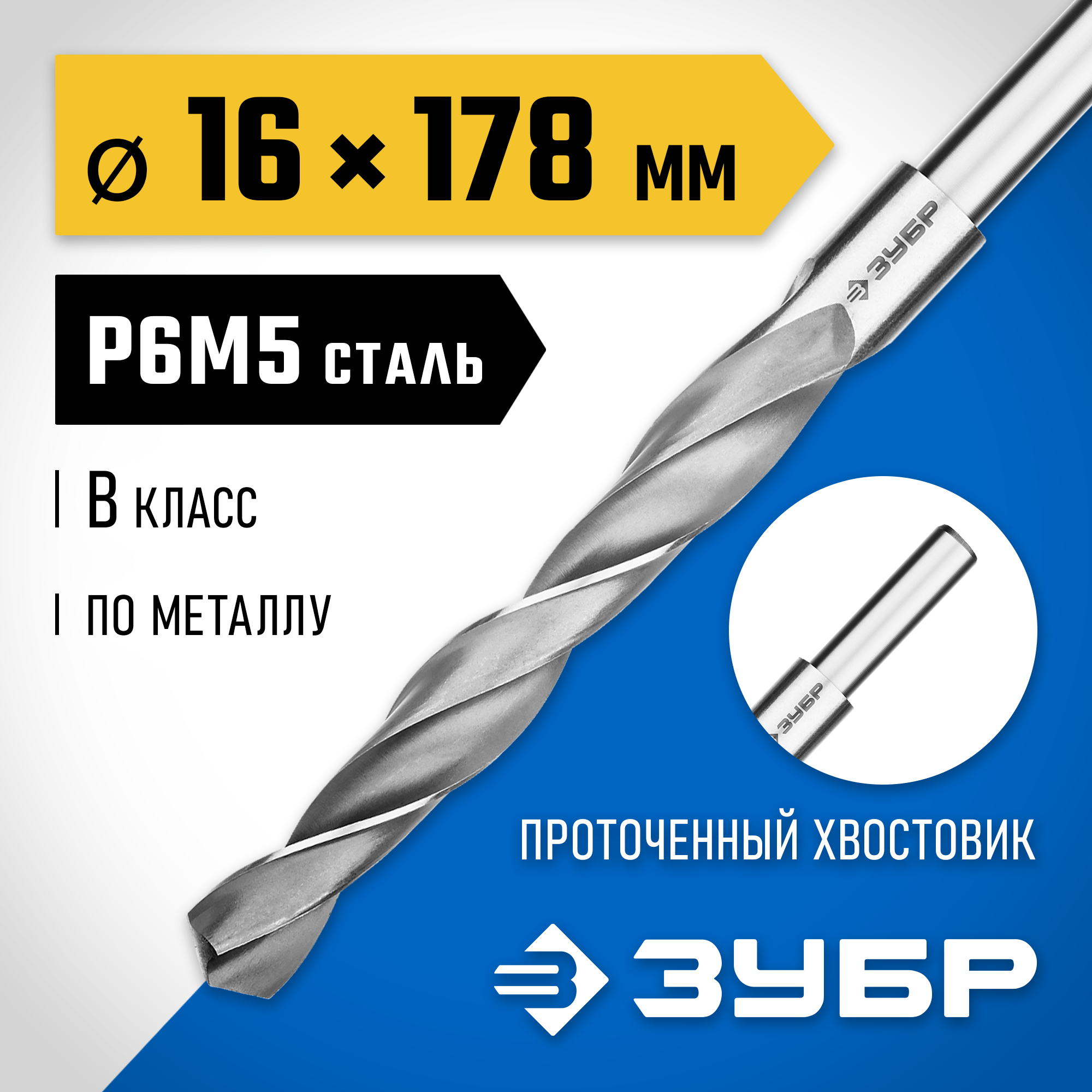 ЗУБР ПРОФ-В, 16.0 х 178 мм, сталь Р6М5, класс В, проточенный хвостовик, сверло по металлу, Профессионал (29621-16)