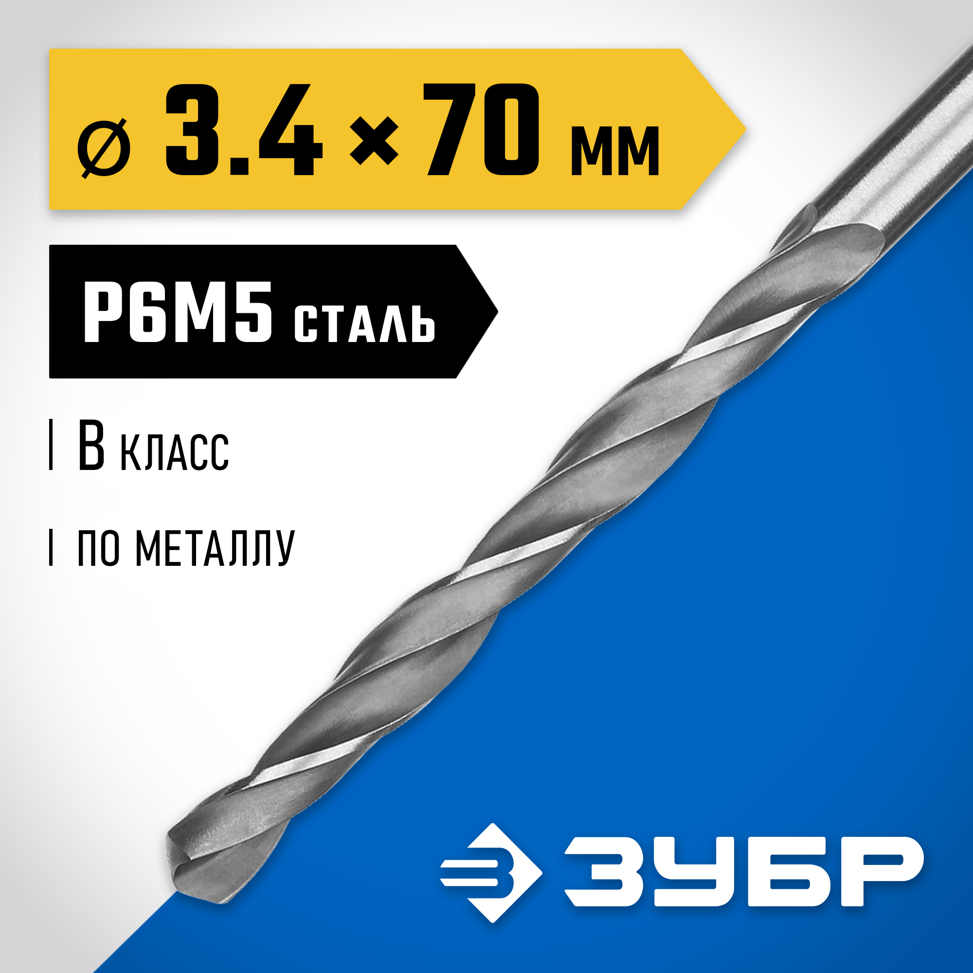 ЗУБР ПРОФ-В, 3.4 х 70 мм, сталь Р6М5, класс В, сверло по металлу, Профессионал (29621-3.4)