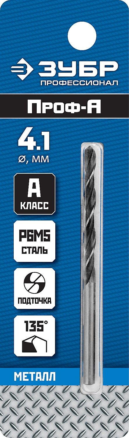ЗУБР ПРОФ-В, 4.1 х 75 мм, сталь Р6М5, класс В, сверло по металлу, Профессионал (29621-4.1)